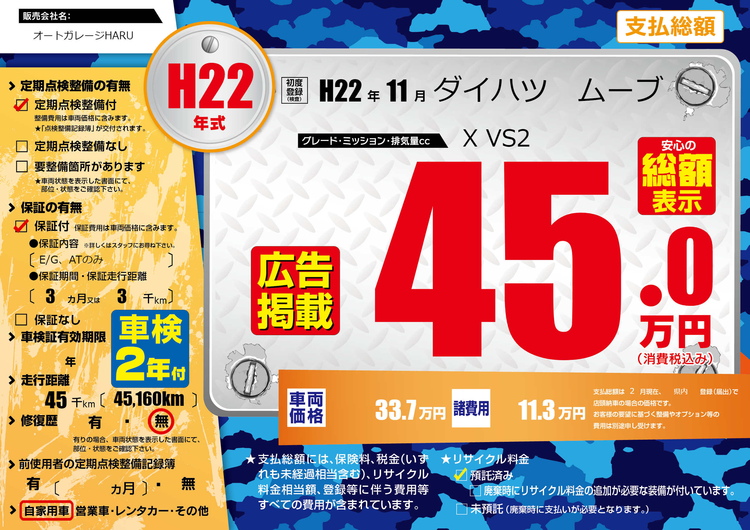 | 走行キロ | 4.5万km | 初年度登録 | H22年11月 |