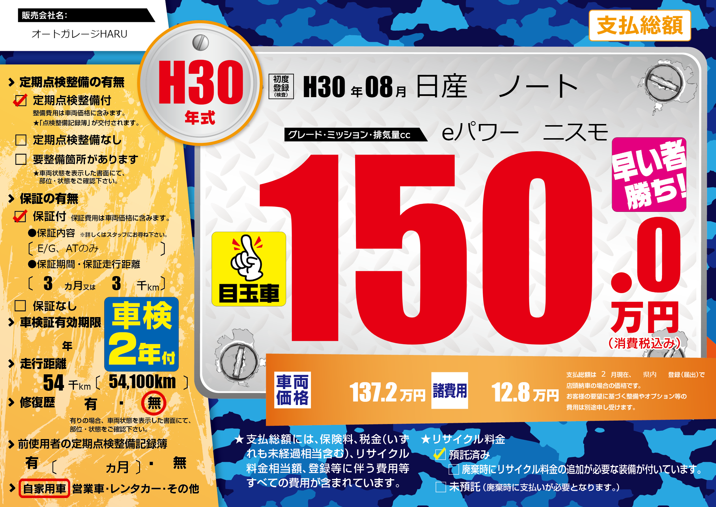 | 走行キロ | 5.4万km | 初年度登録 | H30年08月 |