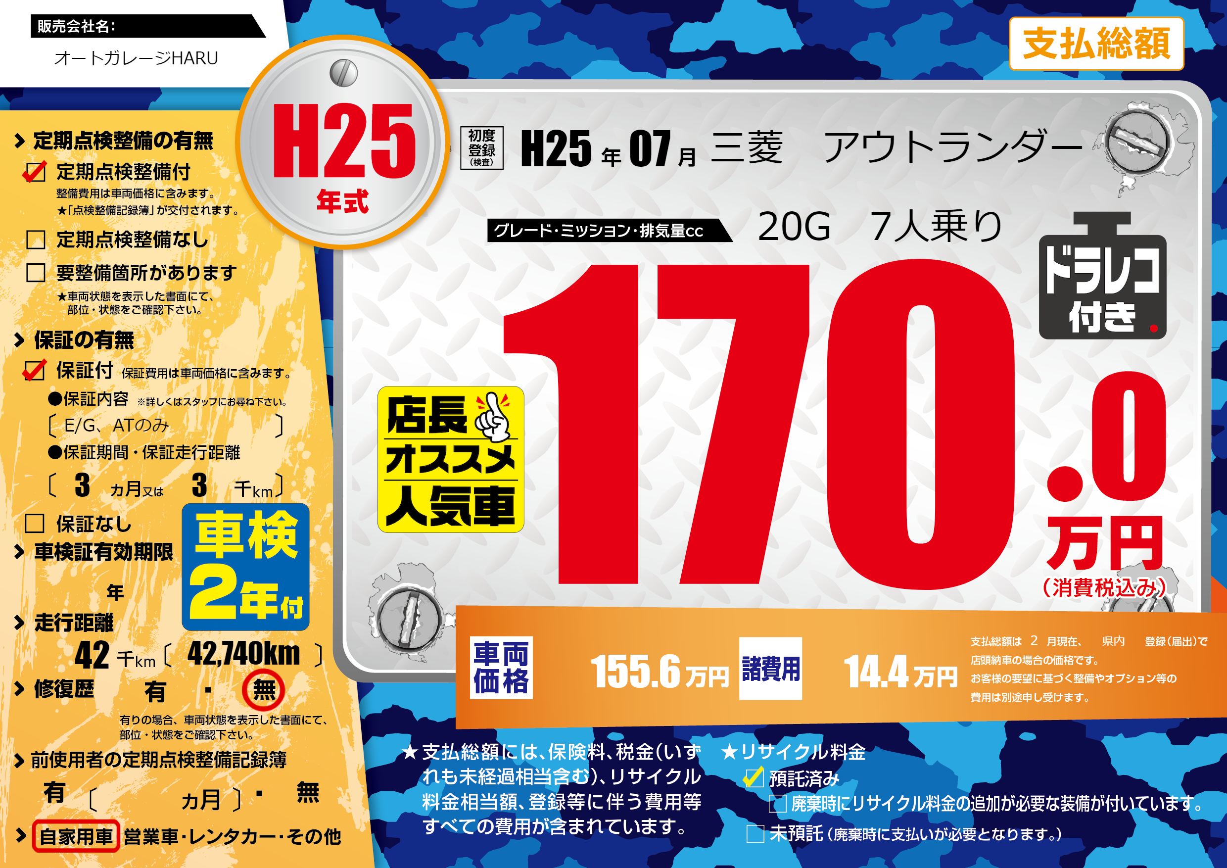 | 走行キロ | 4.2万km | 初年度登録 | H25年07月 |
