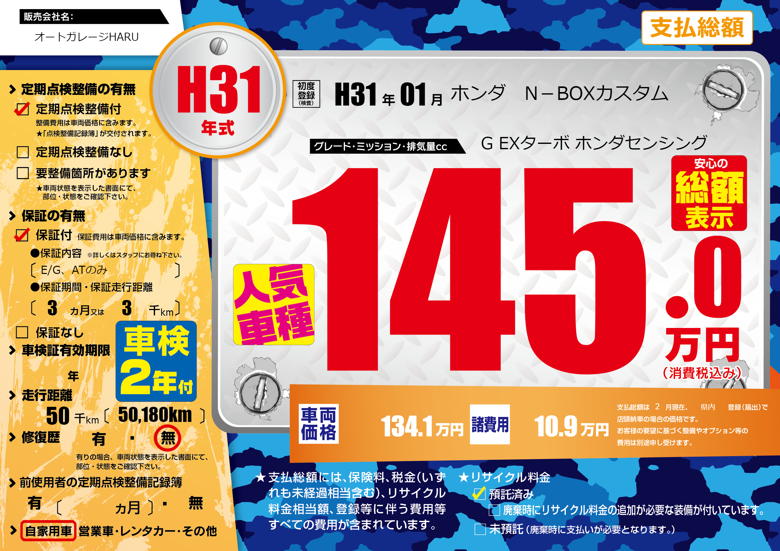 | 走行キロ | 5万km | 初年度登録 | H31年01月 |
