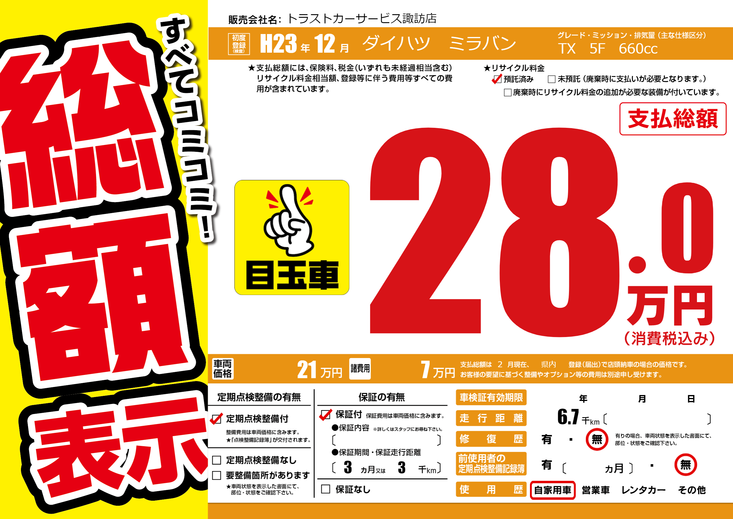 | 車名 | ダイハツ ミラバン | グレード ミッション 排気量 |