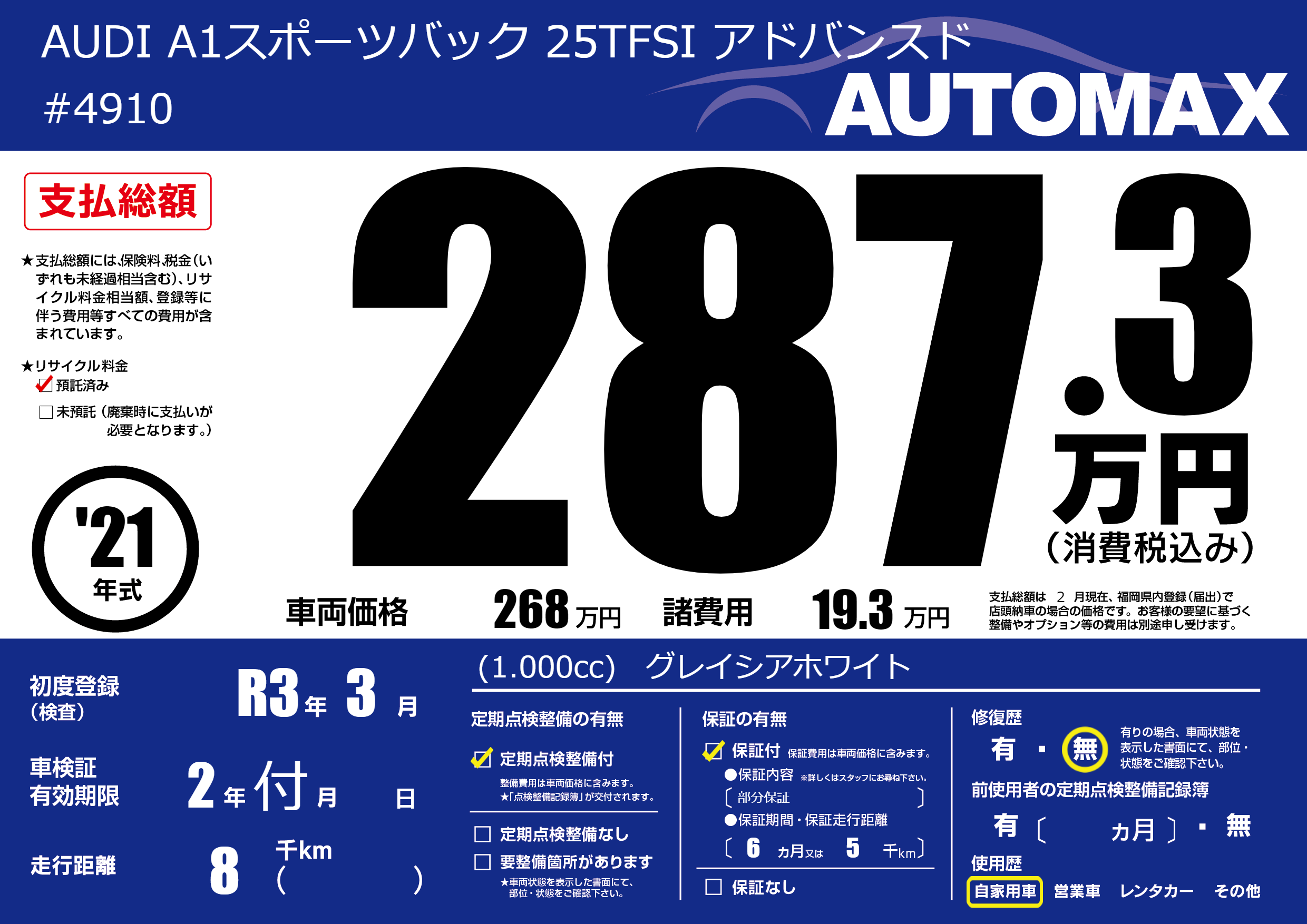 | 車名 | AUDI A1スポーツバック 25TFSI アドバンスド | グレード ミッション 排気量 |