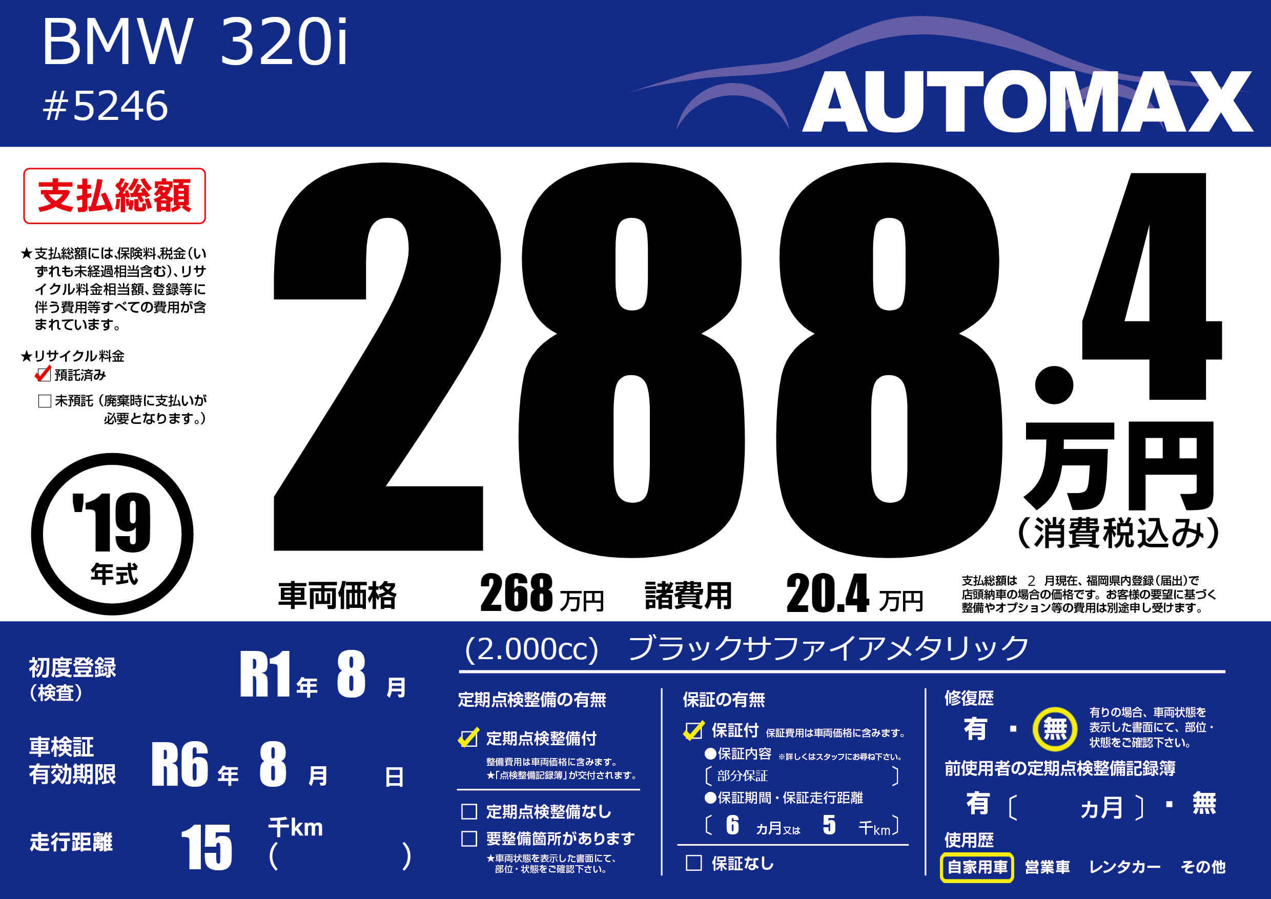 | 車名 | BMW 320i | グレード ミッション 排気量 |