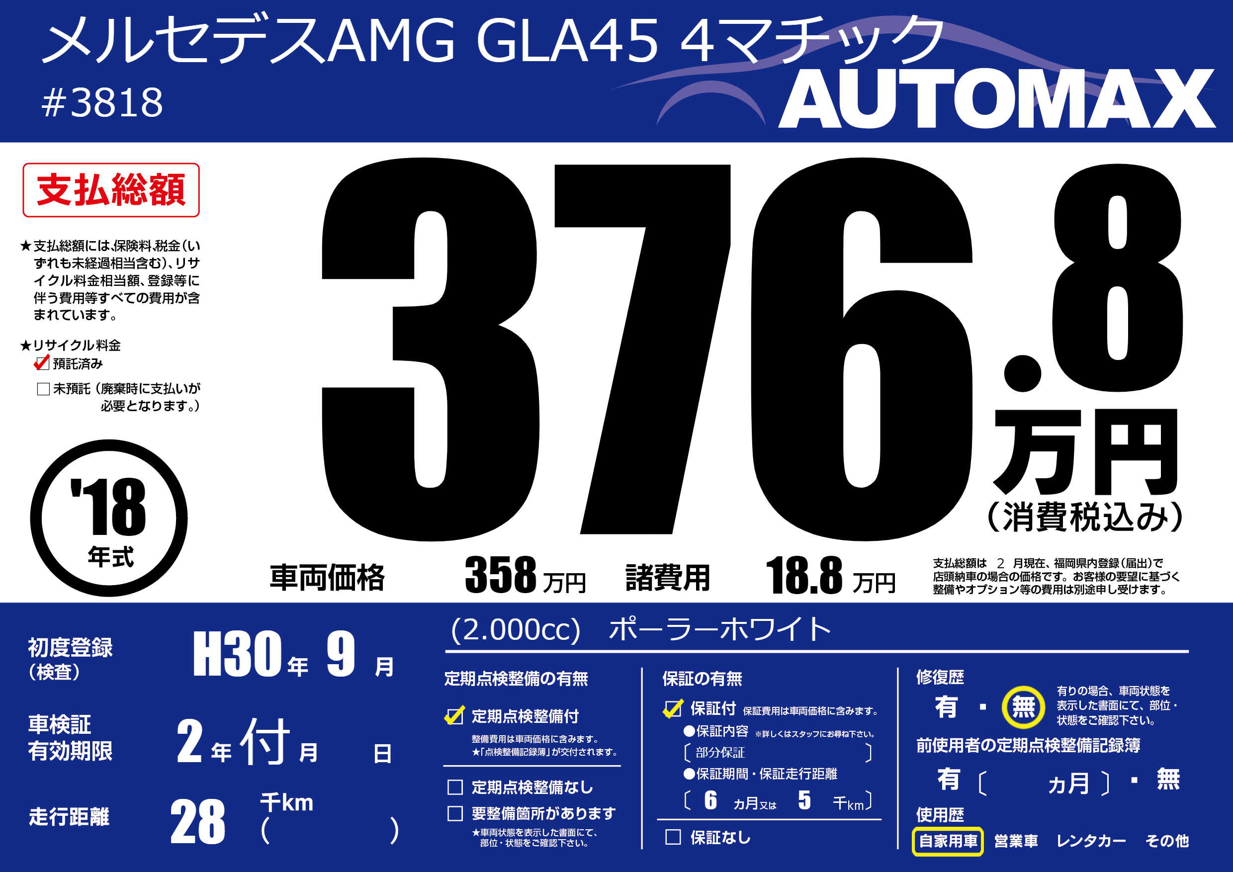 | 車名 | メルセデスAMG GLA45 4マチック | グレード ミッション 排気量 |