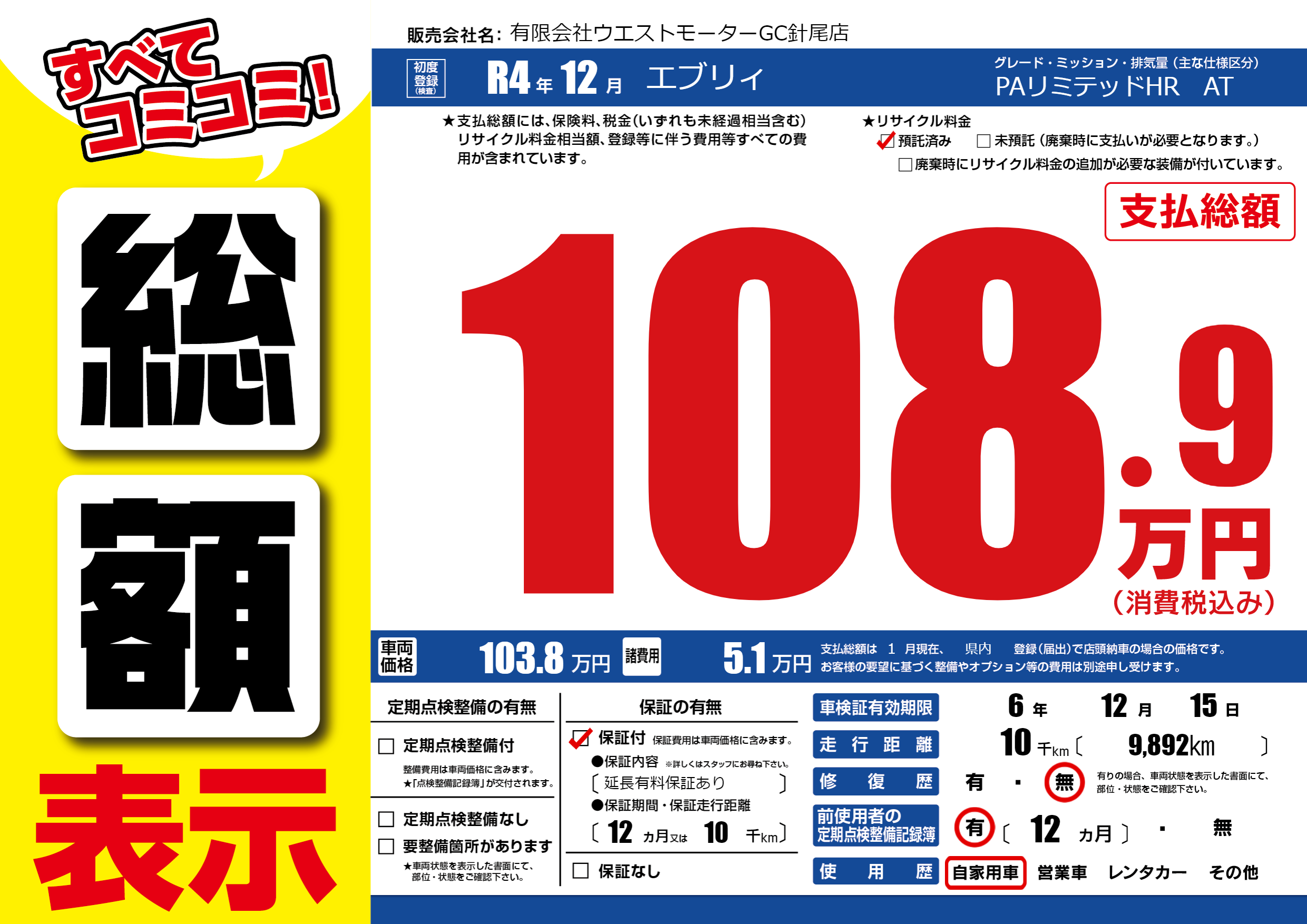 | 車名 | エブリィ | グレード ミッション 排気量 |