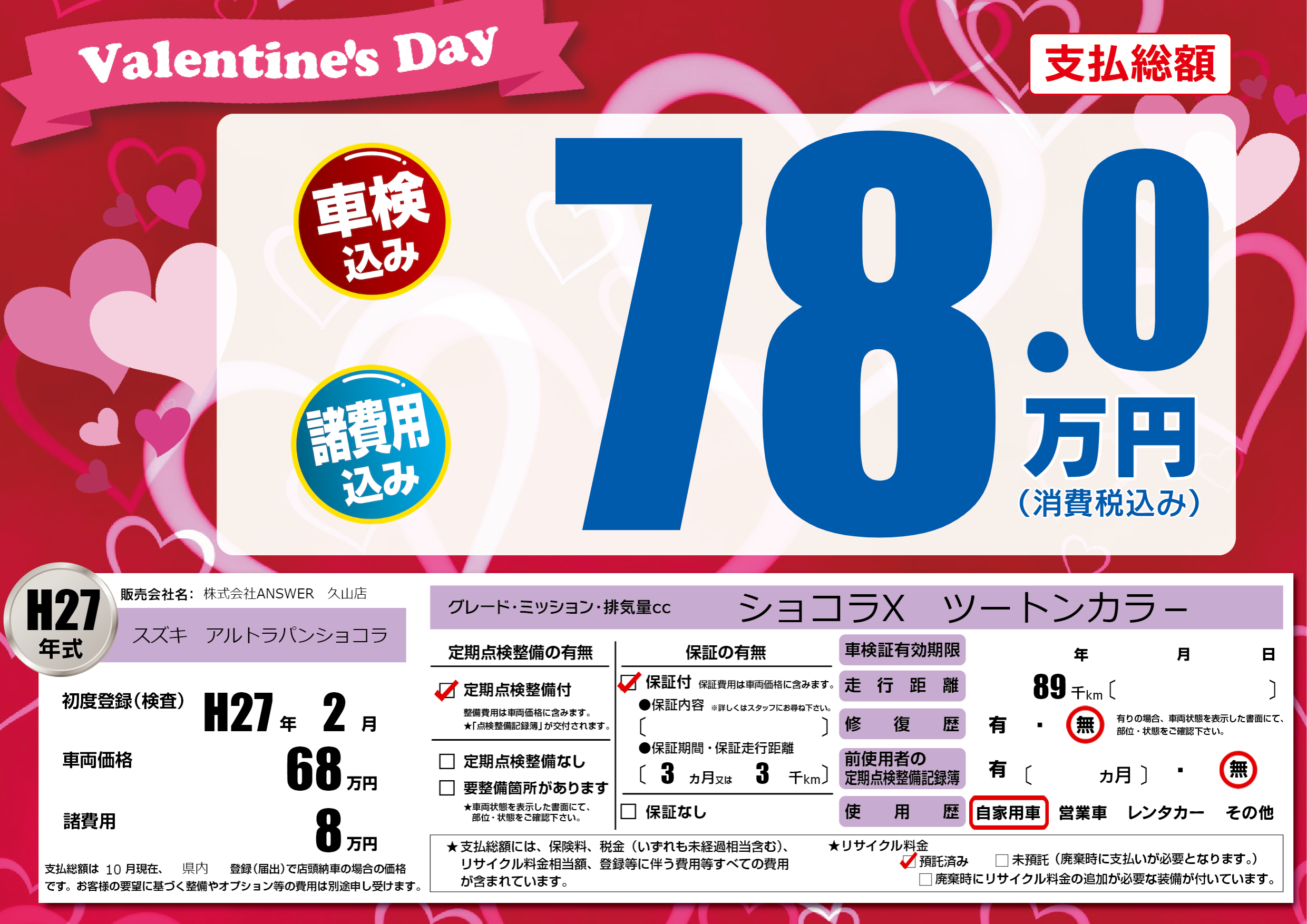 | 走行キロ | 8.9万km | 初年度登録 | H27年2月 |