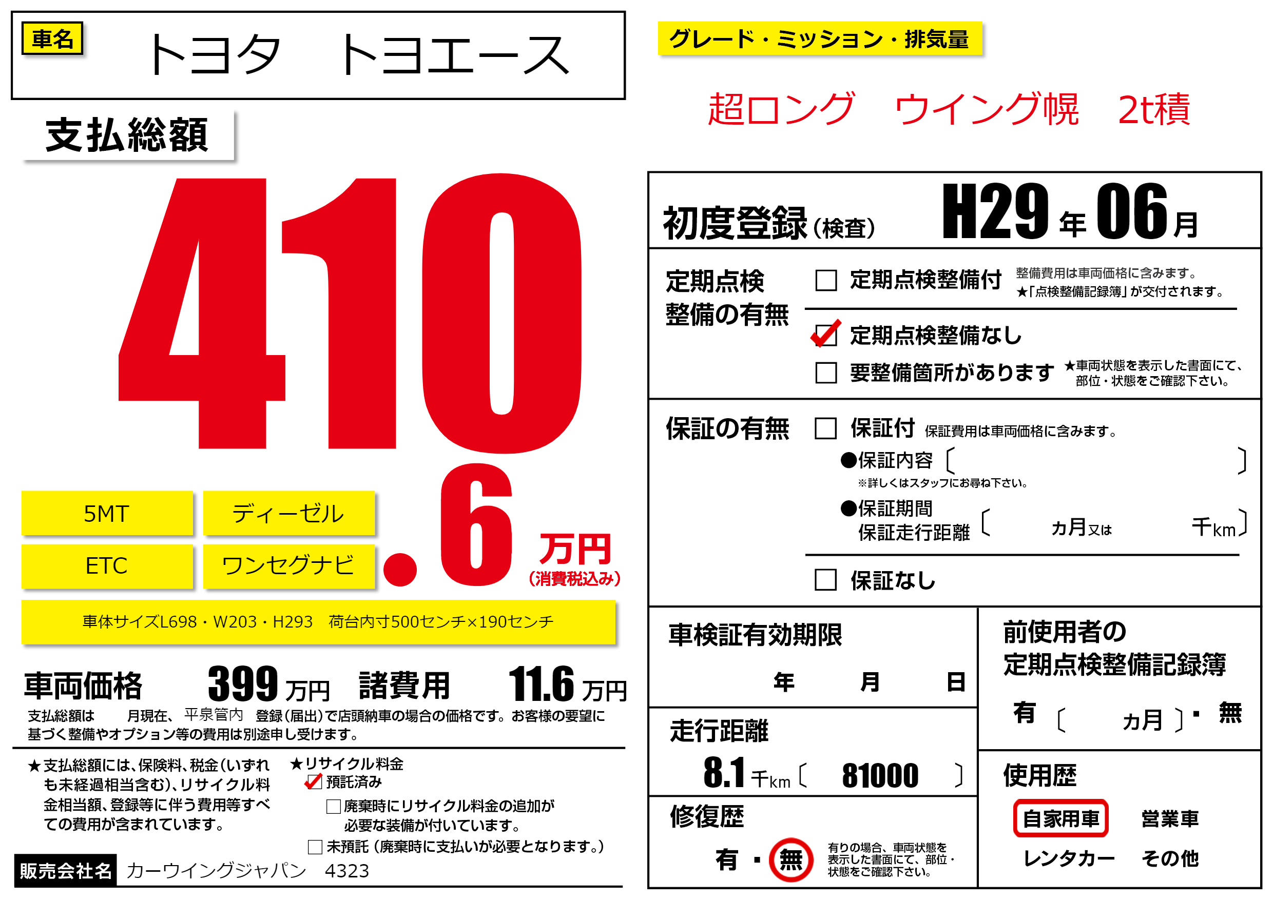 | 走行キロ | 0.8万km | 初年度登録 | H29年06月 |