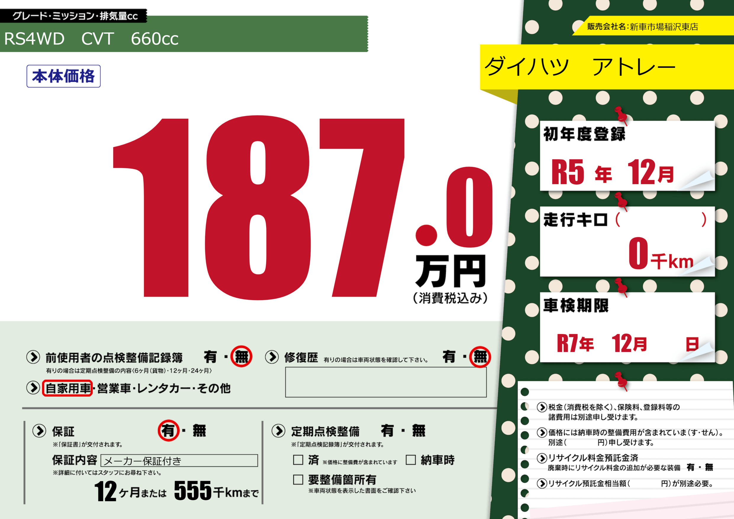 | 走行キロ | - | 初年度登録 | R5年12月 |