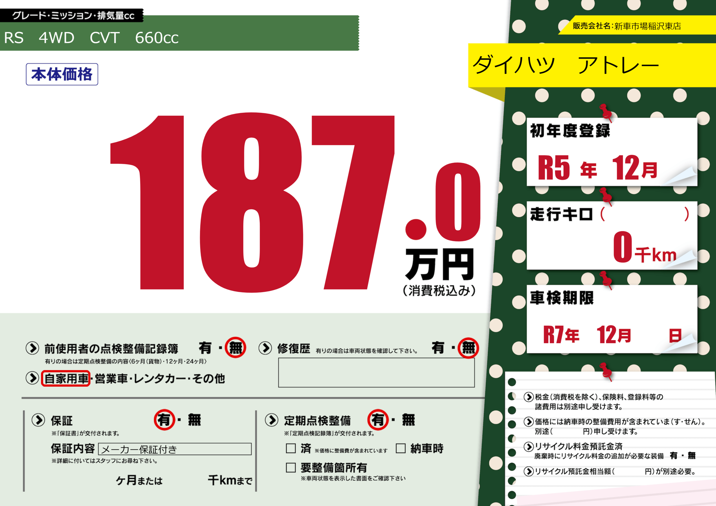| 走行キロ | - | 初年度登録 | R5年12月 |