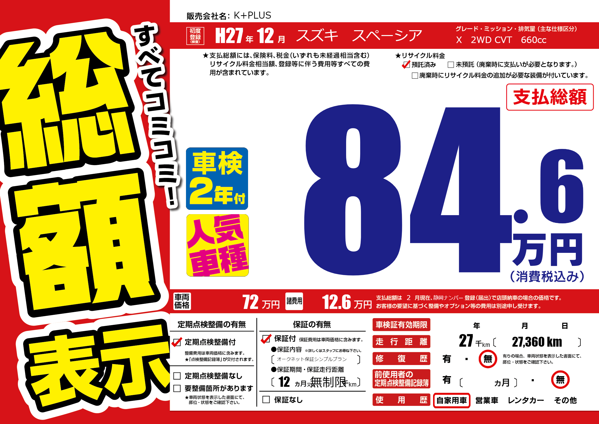 | 走行キロ | 2.7万km | 初年度登録 | H27年12月 |
