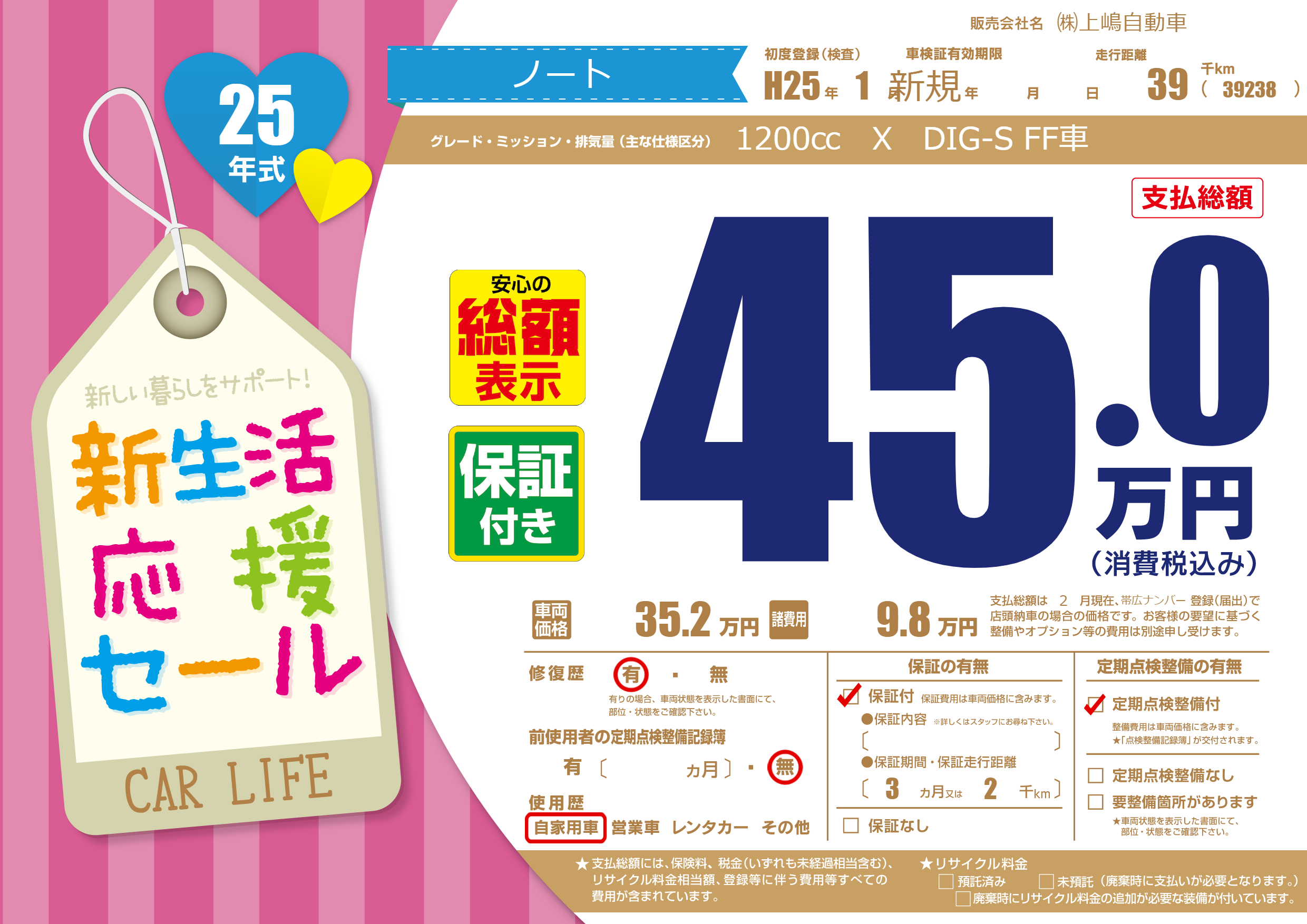 保証付き 保証内容(---) 3ヶ月または(2)千kmまで |