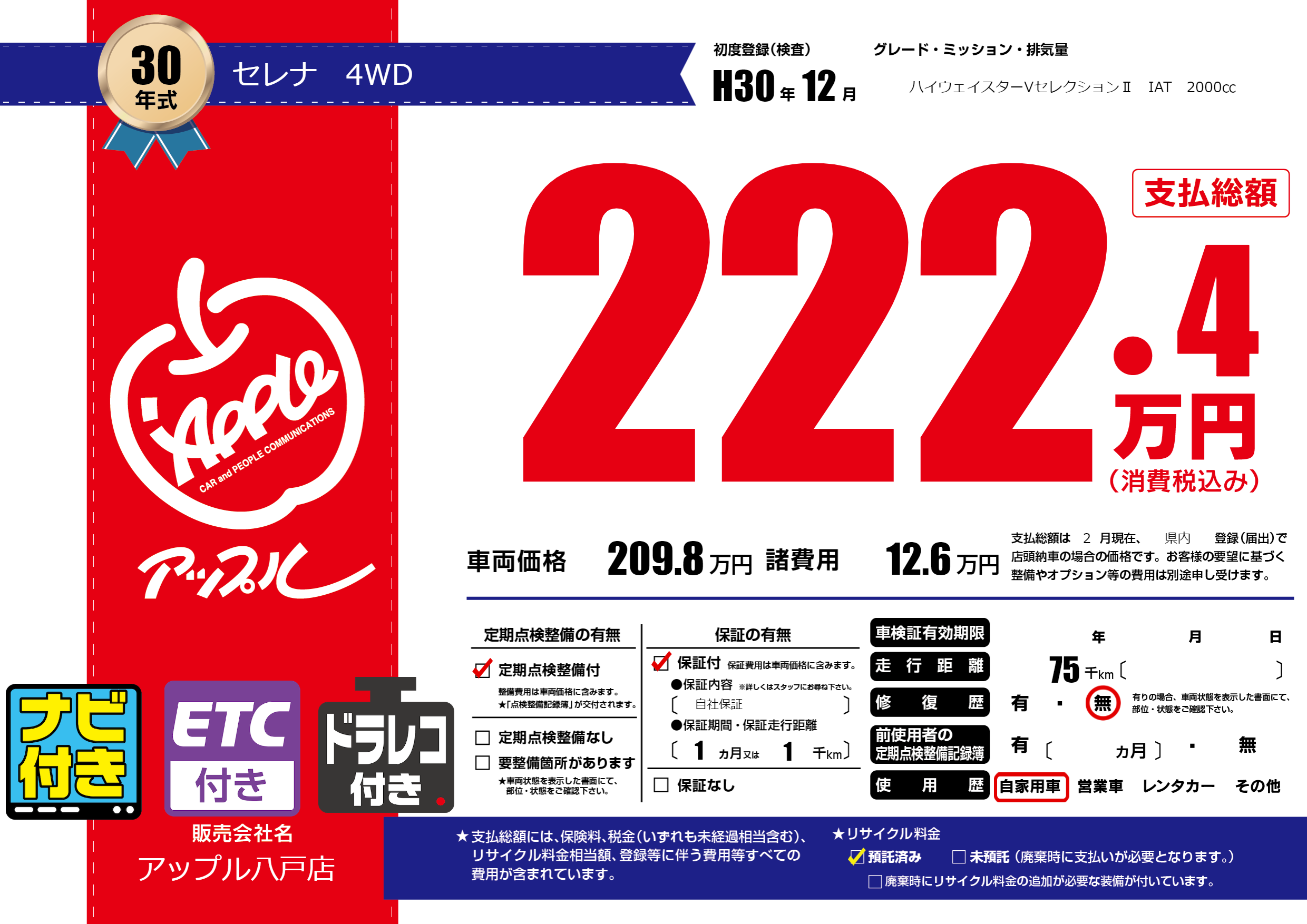 保証付き 保証内容( 自社保証) 1ヶ月または(1)千kmまで |