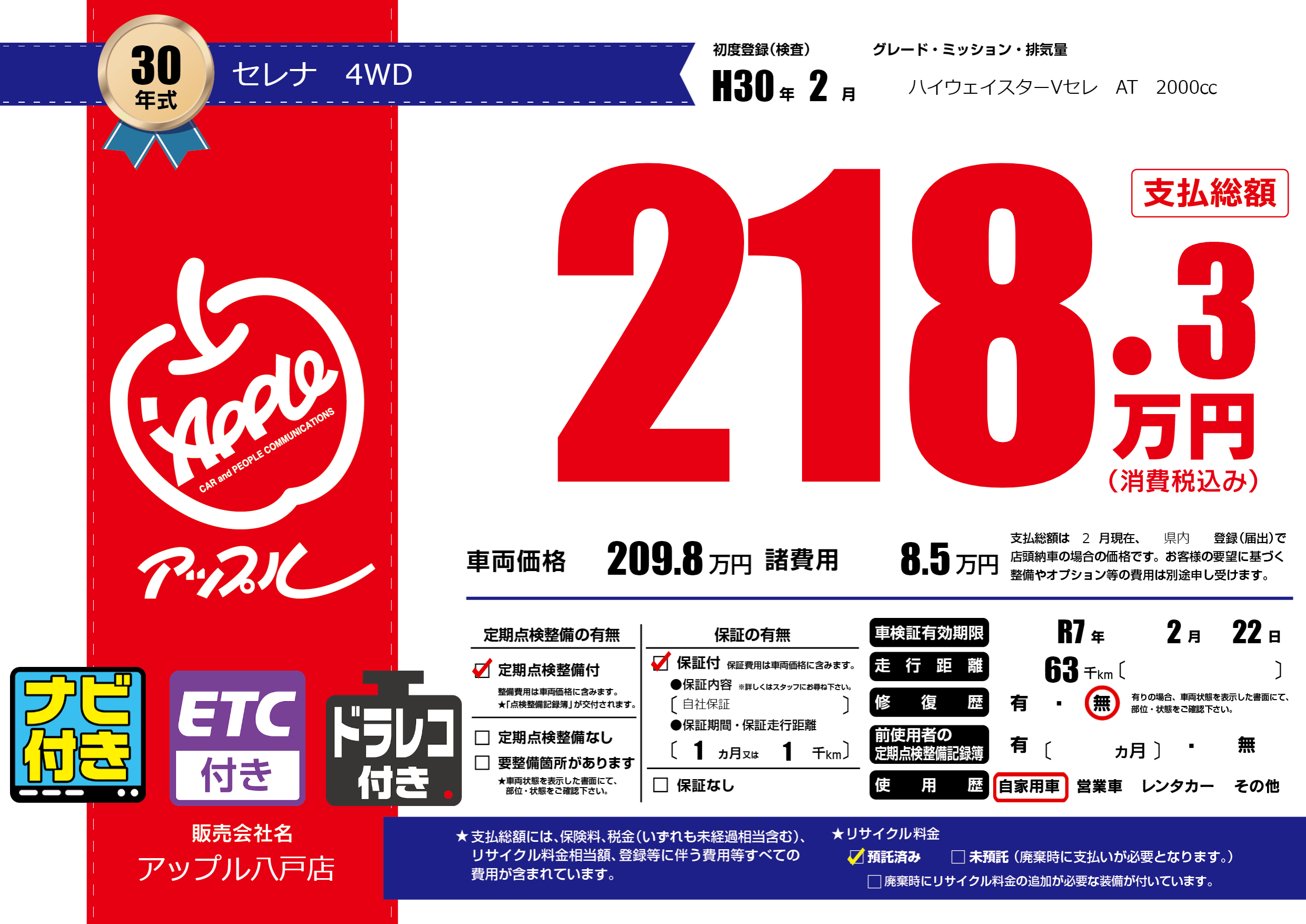| 車検制限 | R7年 2月 22日 | ||