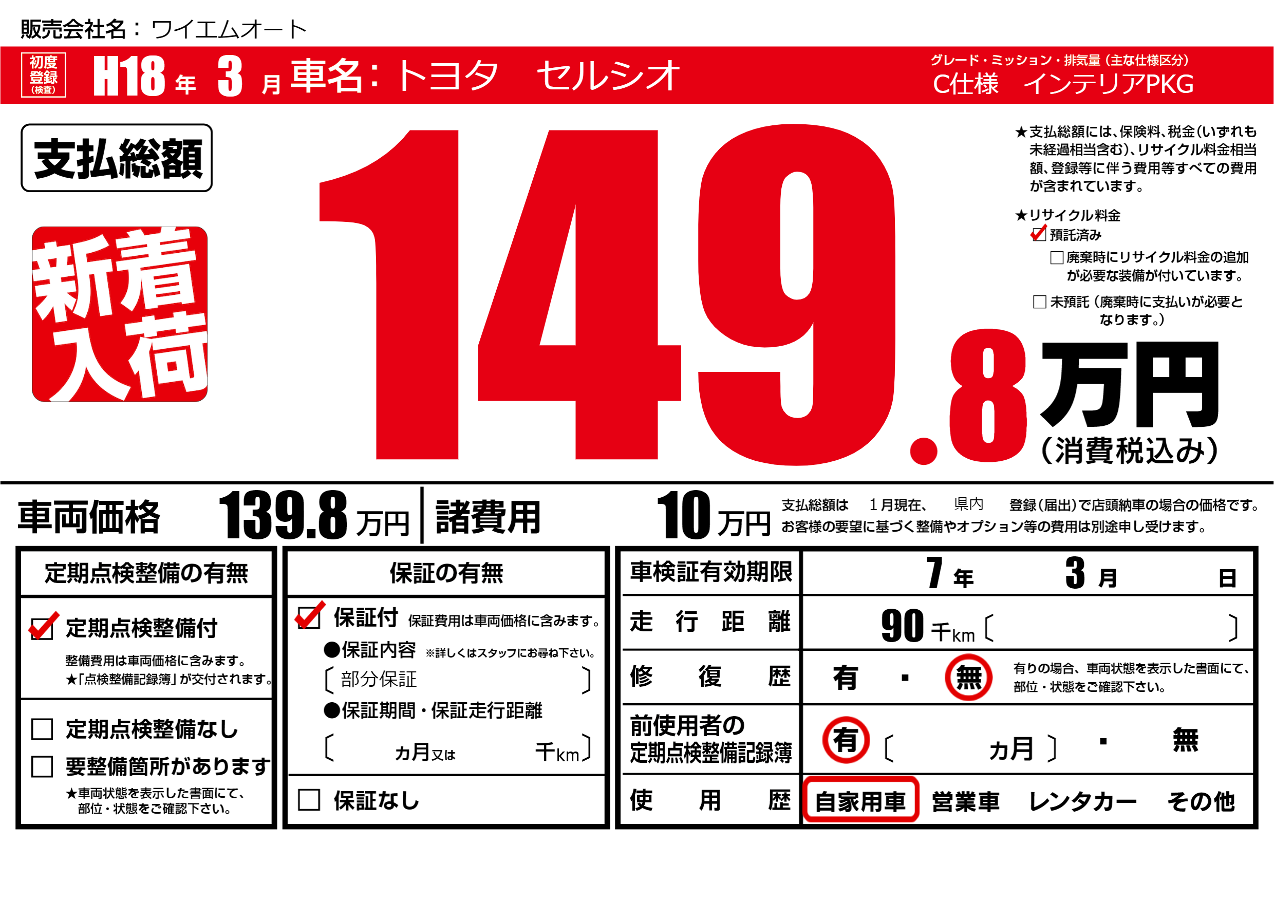 | 走行キロ | 9万km | 初年度登録 | H18年3月 |