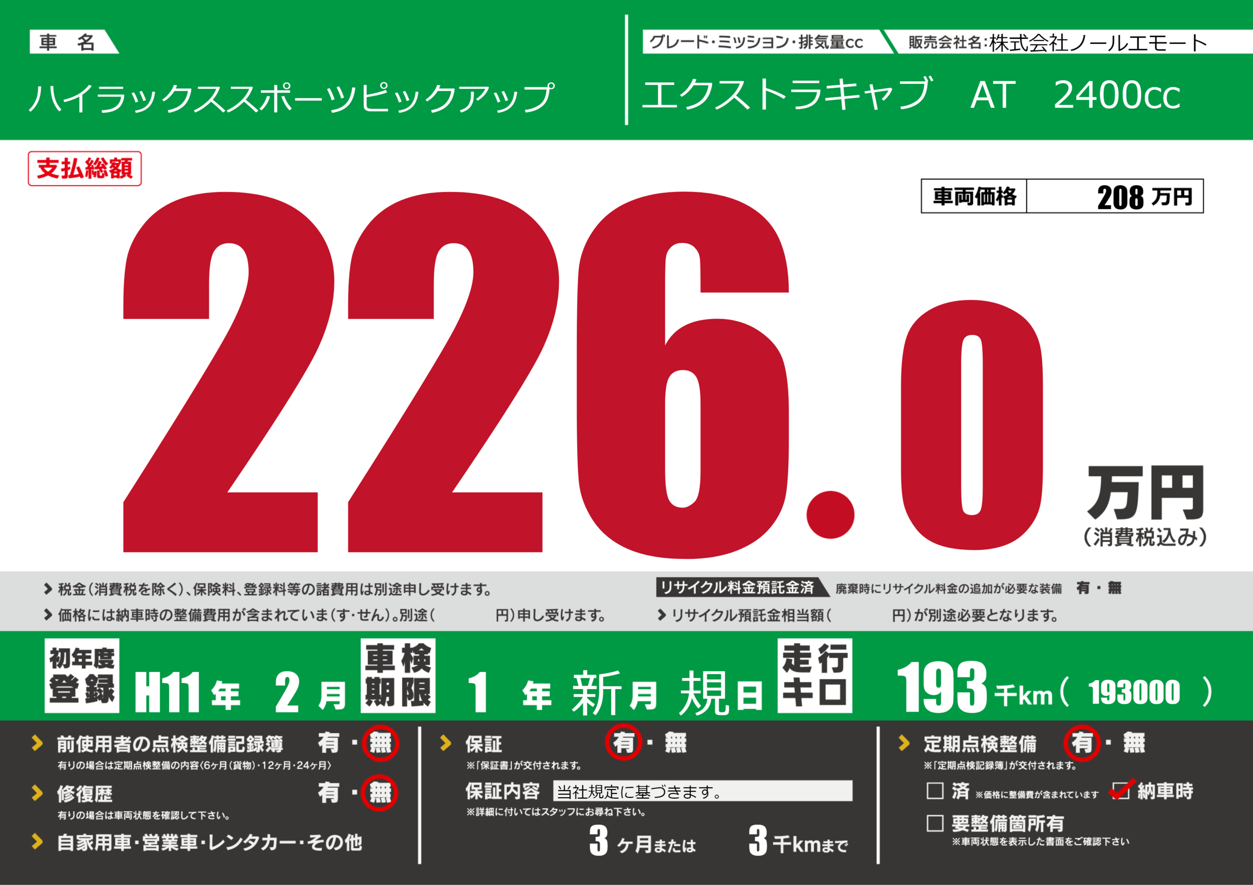 保証付き 保証内容(当社規定に基づきます。) 3ヶ月または(3)千kmまで |