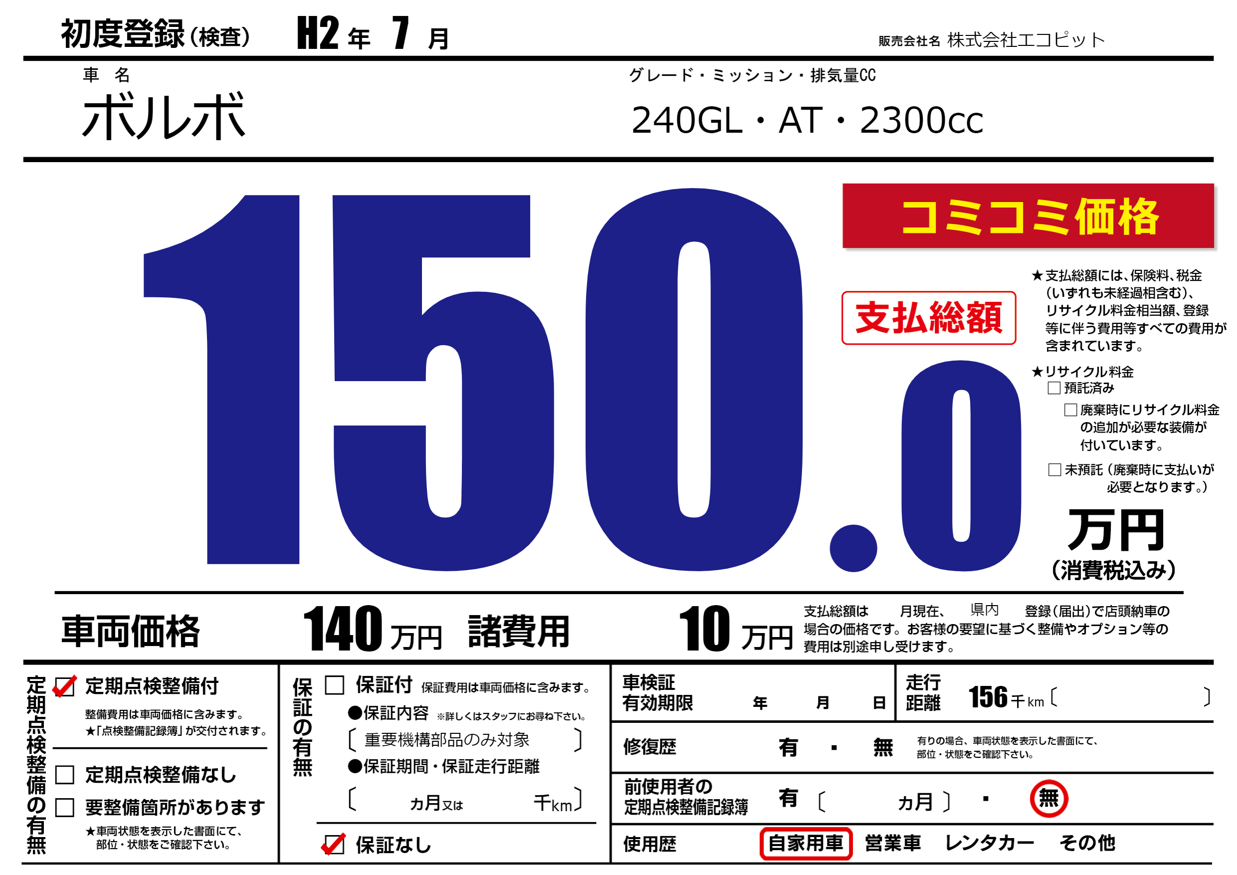 | 走行キロ | 15.6万km | 初年度登録 | H2年7月 |