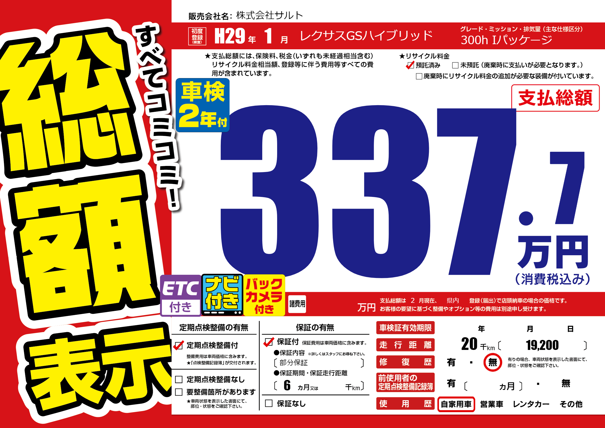 | 車名 | レクサスGSハイブリッド | グレード ミッション 排気量 |