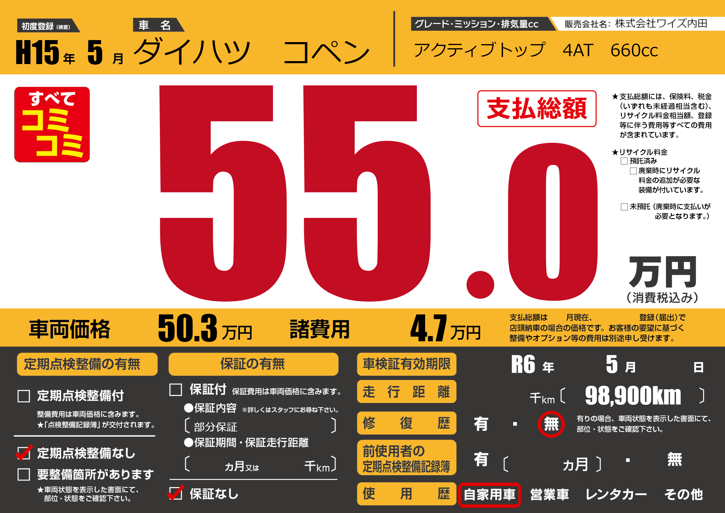 | 車名 | ダイハツ コペン | グレード ミッション 排気量 |