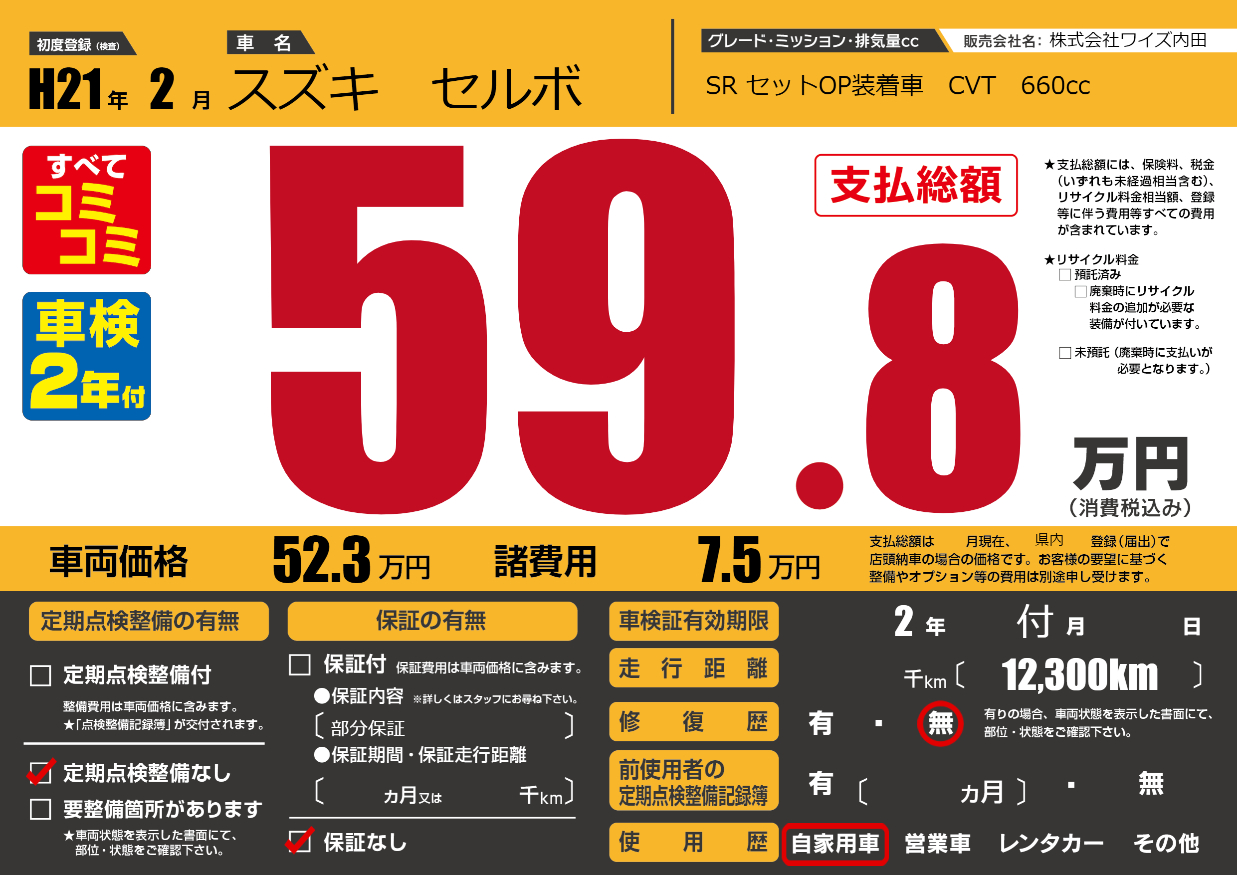 | 車名 | スズキ セルボ | グレード ミッション 排気量 |