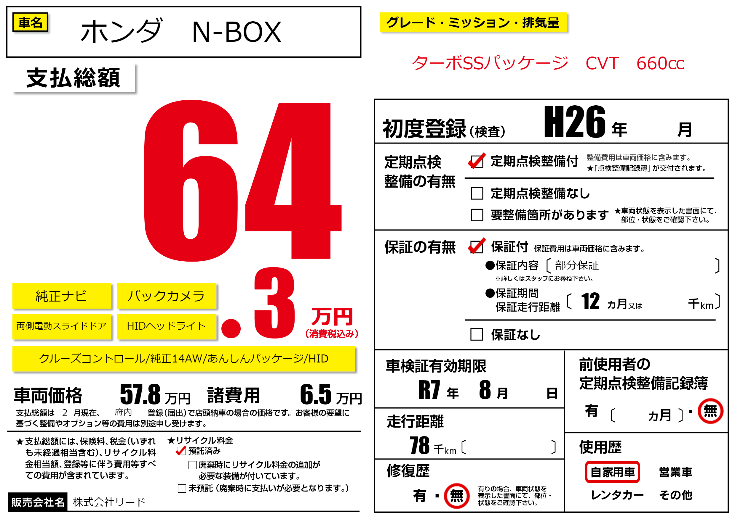 | 車名 | ホンダ N-BOX | グレード ミッション 排気量 |