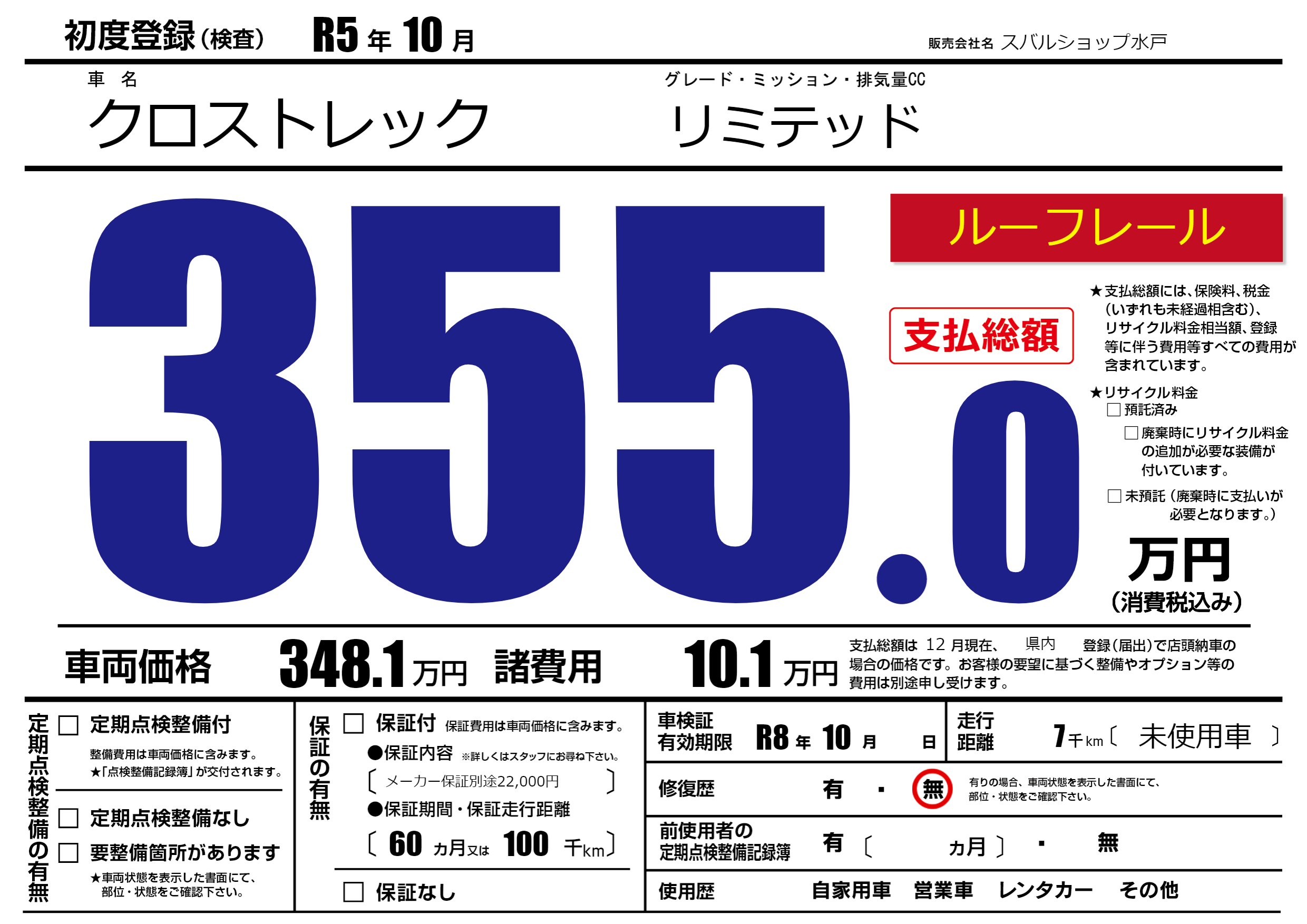 | 走行キロ | 0.7万km | 初年度登録 | R5年10月 |