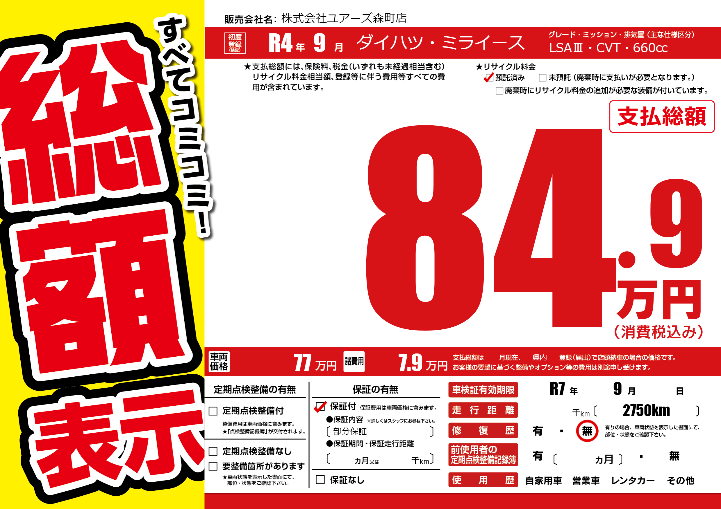| 車検制限 | R7年 9月 - 日 | ||