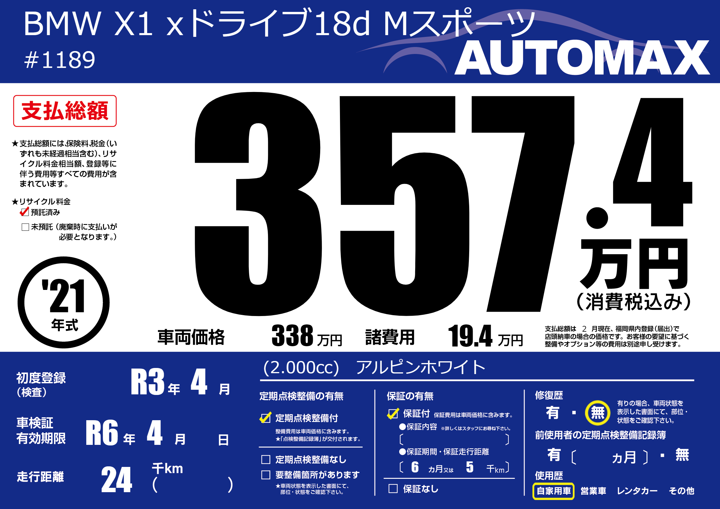 | 車名 | BMW X1 xドライブ18d Mスポーツ | グレード ミッション 排気量 |