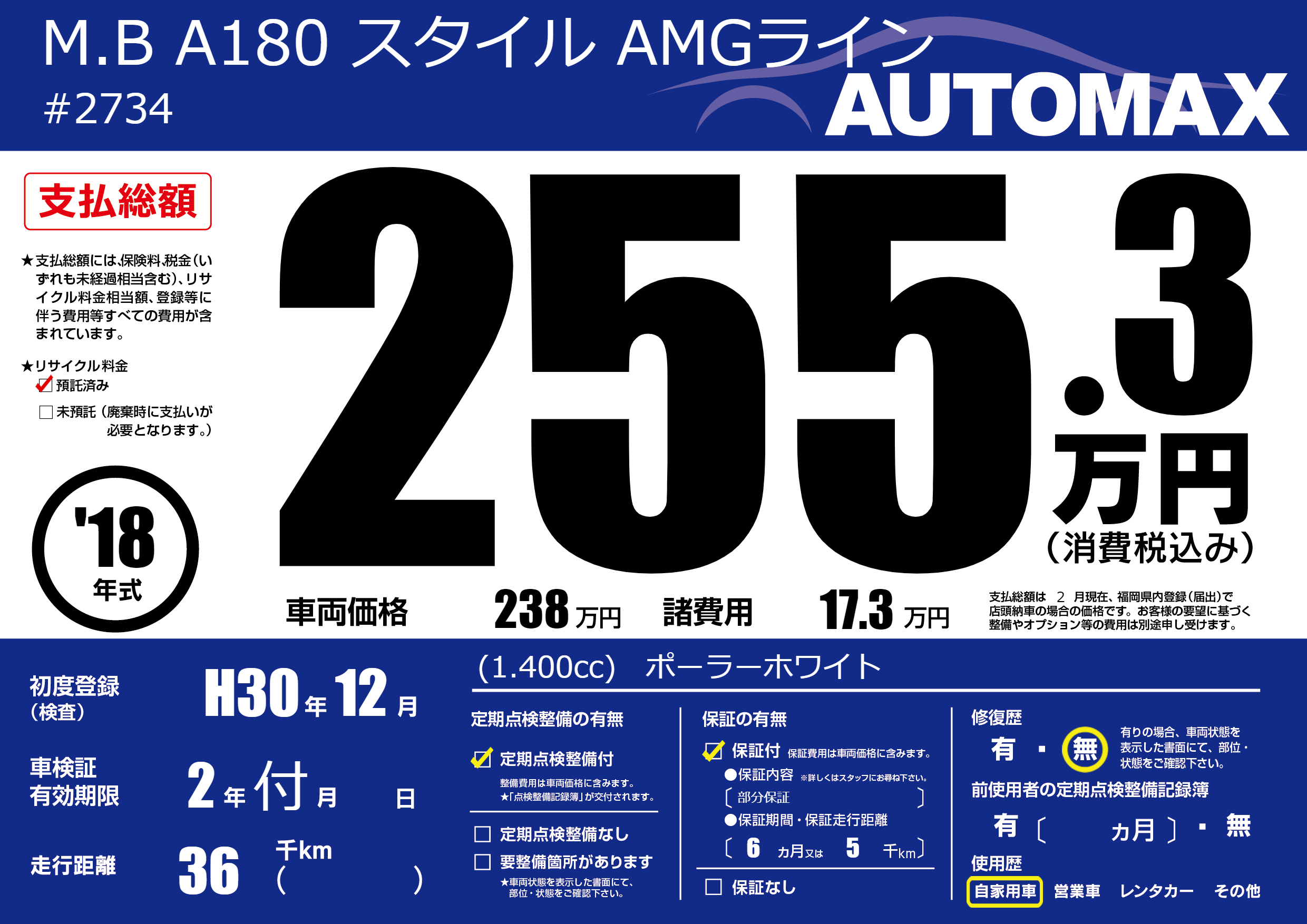 | 車名 | M.B A180 スタイル AMGライン | グレード ミッション 排気量 |