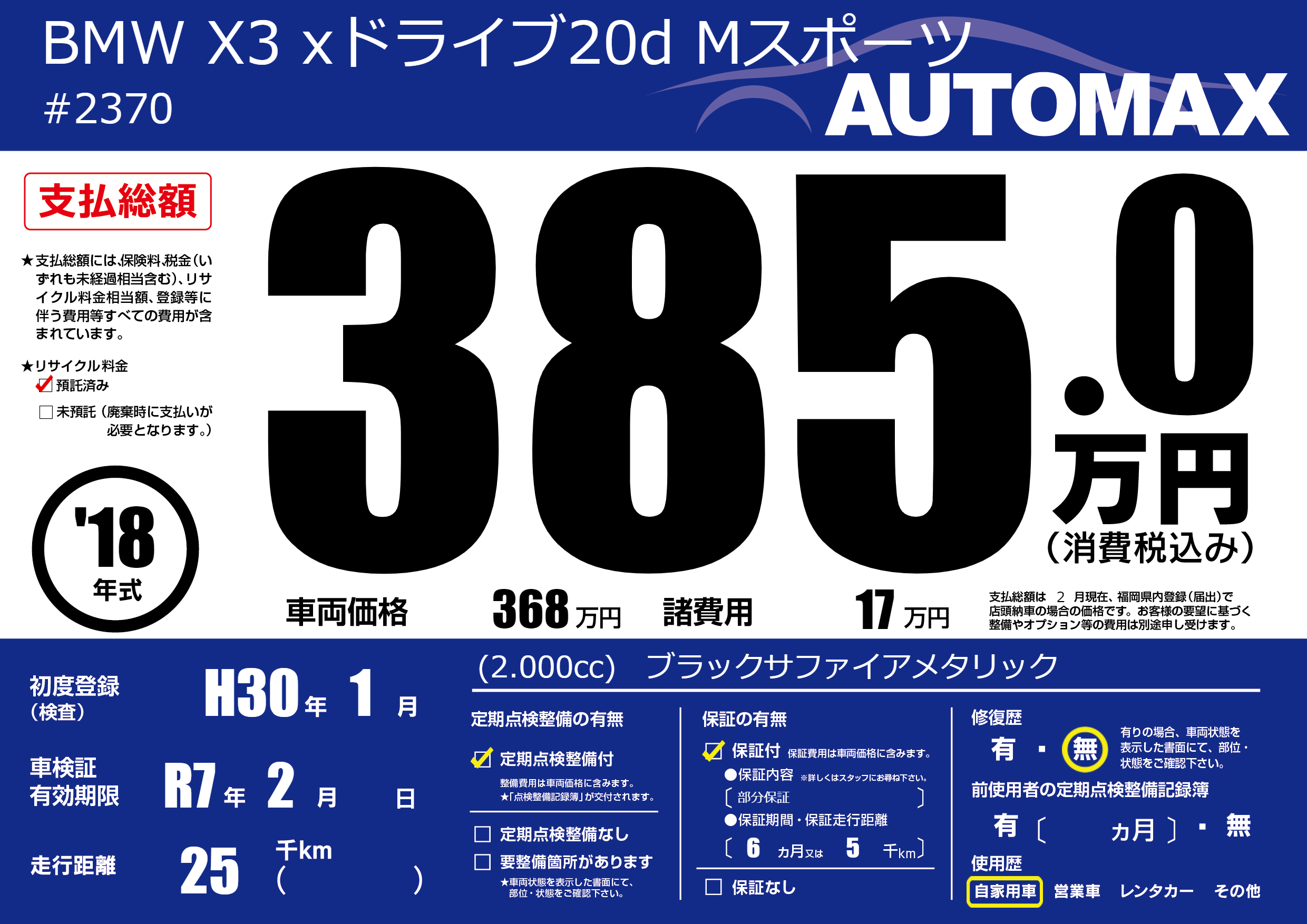 | 車名 | BMW X3 xドライブ20d Mスポーツ | グレード ミッション 排気量 |
