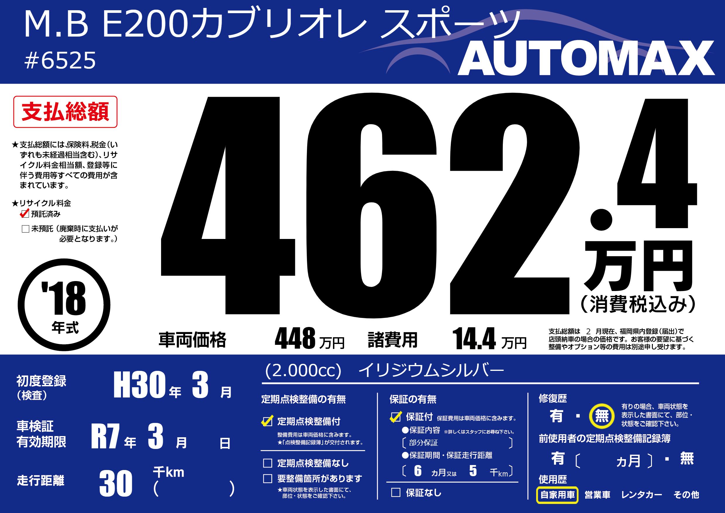 | 車名 | M.B E200カブリオレ スポーツ | グレード ミッション 排気量 |