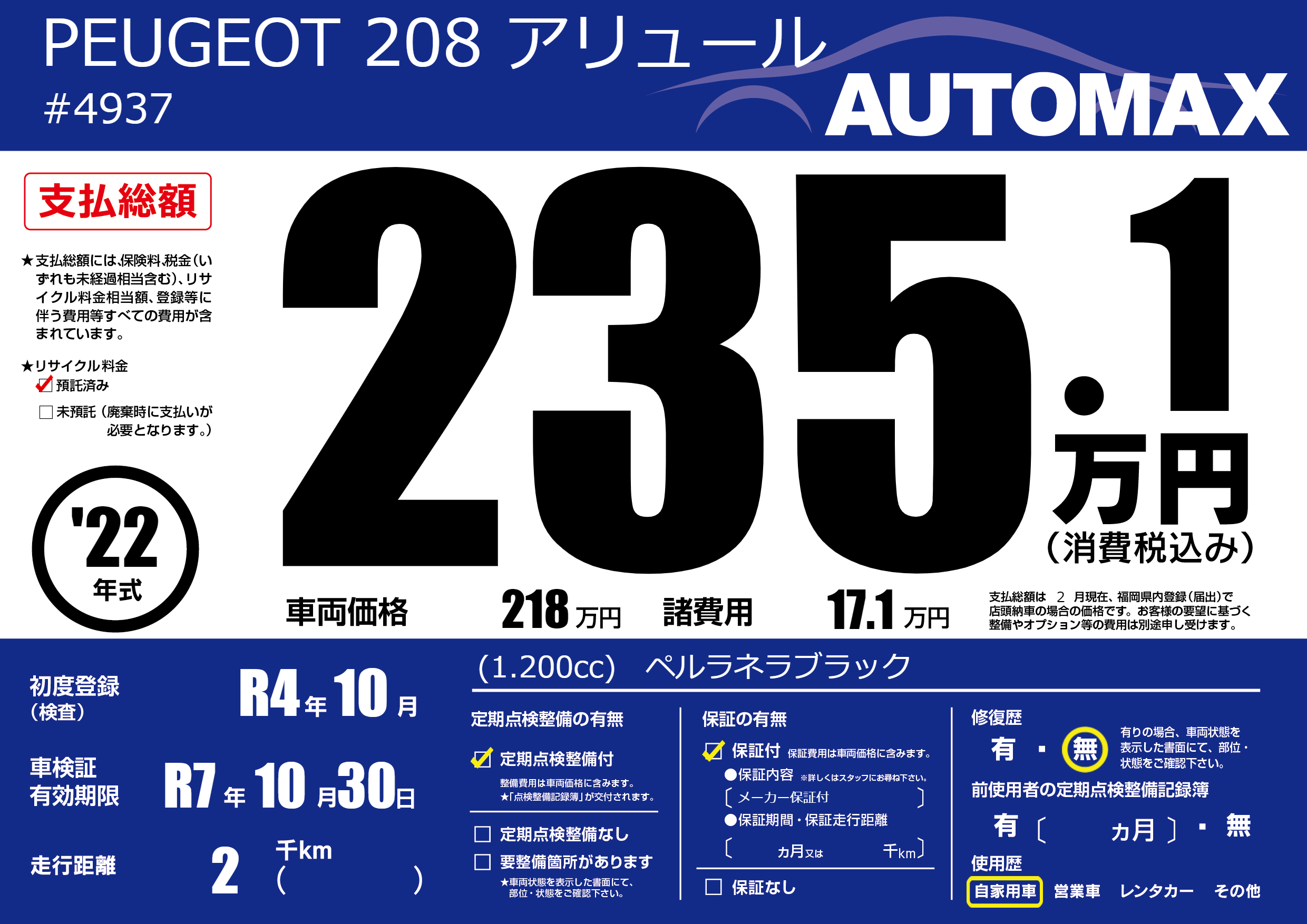 | 車名 | PEUGEOT 208 アリュール | グレード ミッション 排気量 |