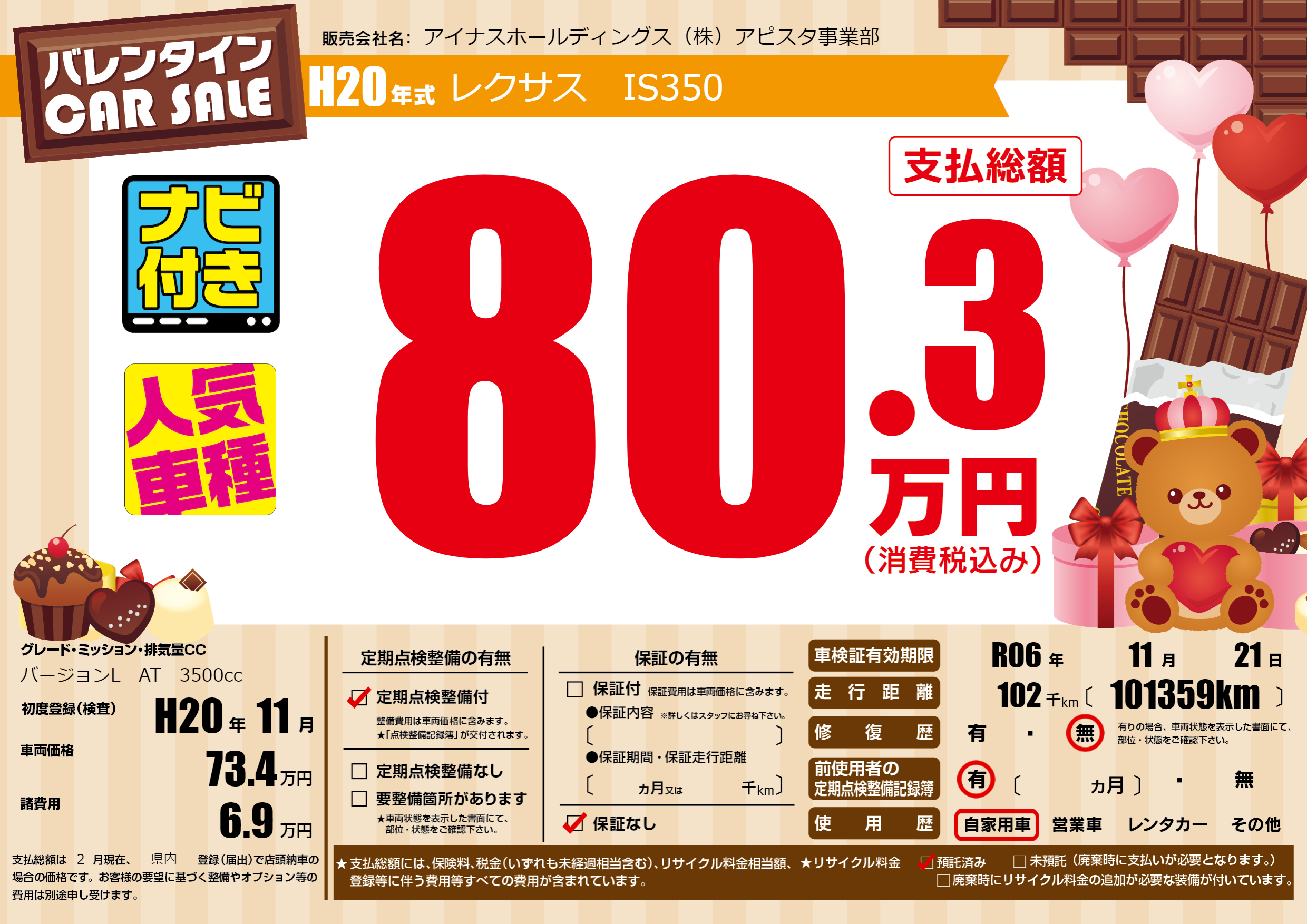 | 車名 | レクサス IS350 | グレード ミッション 排気量 |