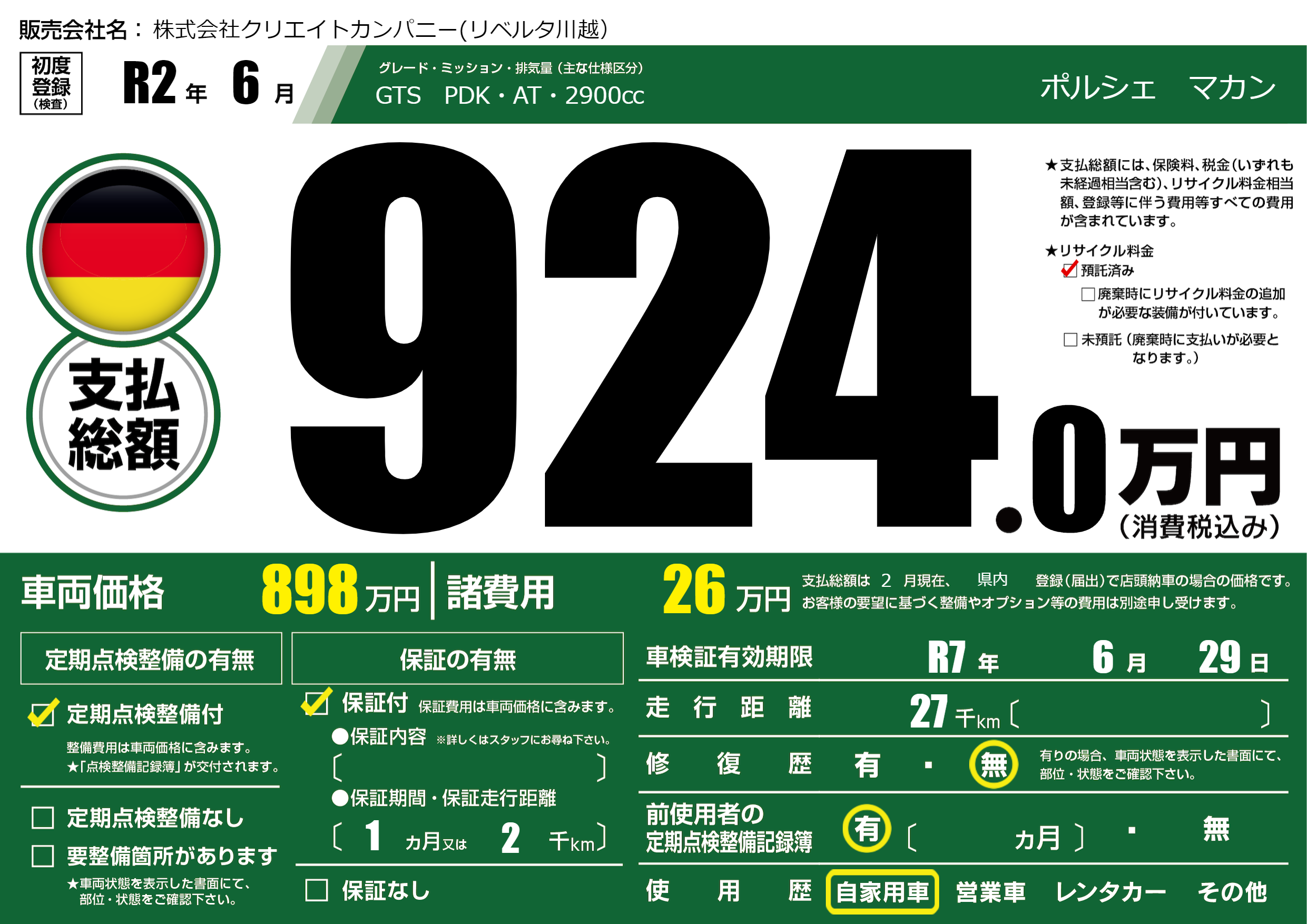 | 車名 | ポルシェ マカン | グレード ミッション 排気量 |