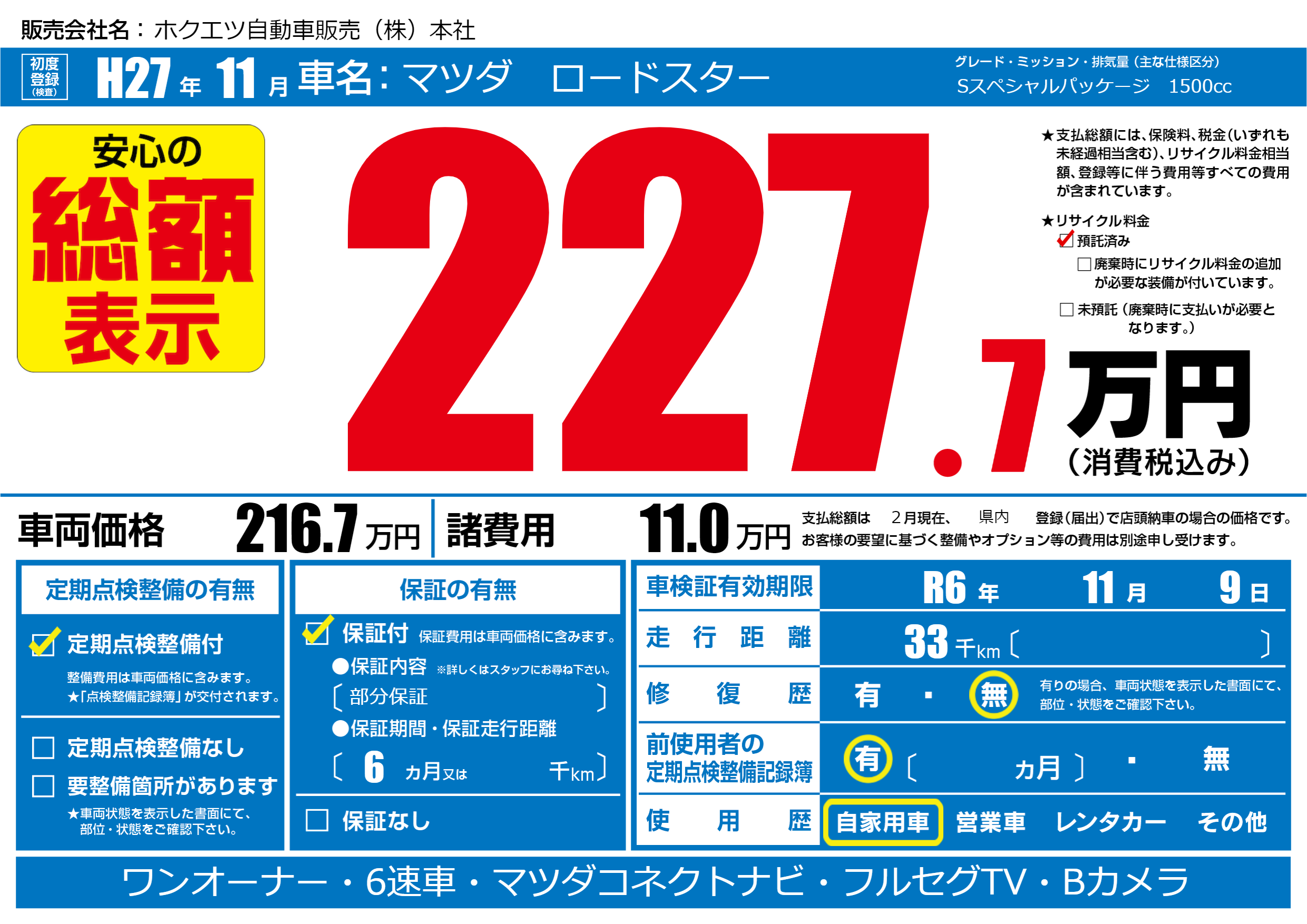 | 走行キロ | 3.3万km | 初年度登録 | H27年11月 |