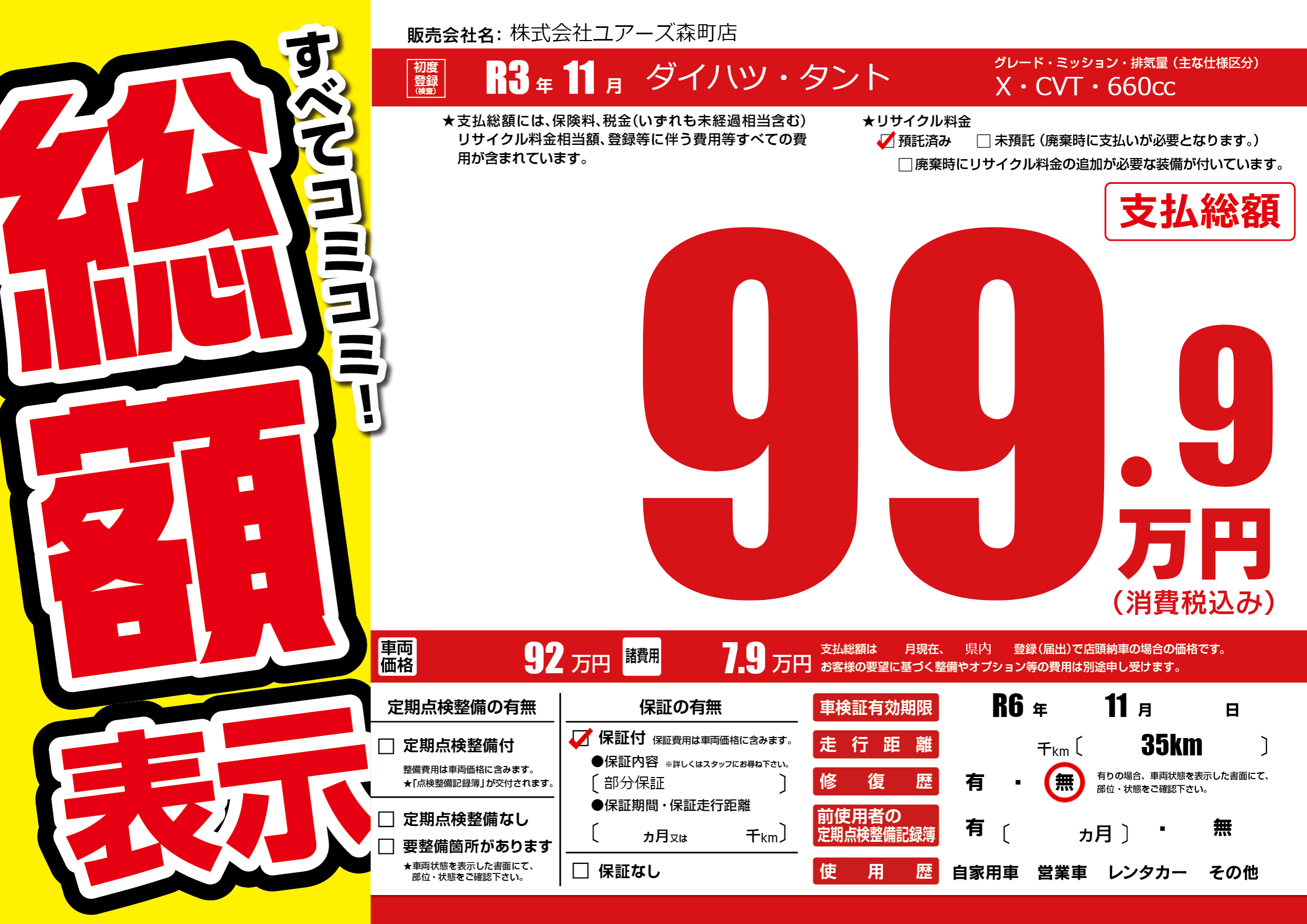 保証付き 保証内容(部分保証) ---ヶ月または()千kmまで |