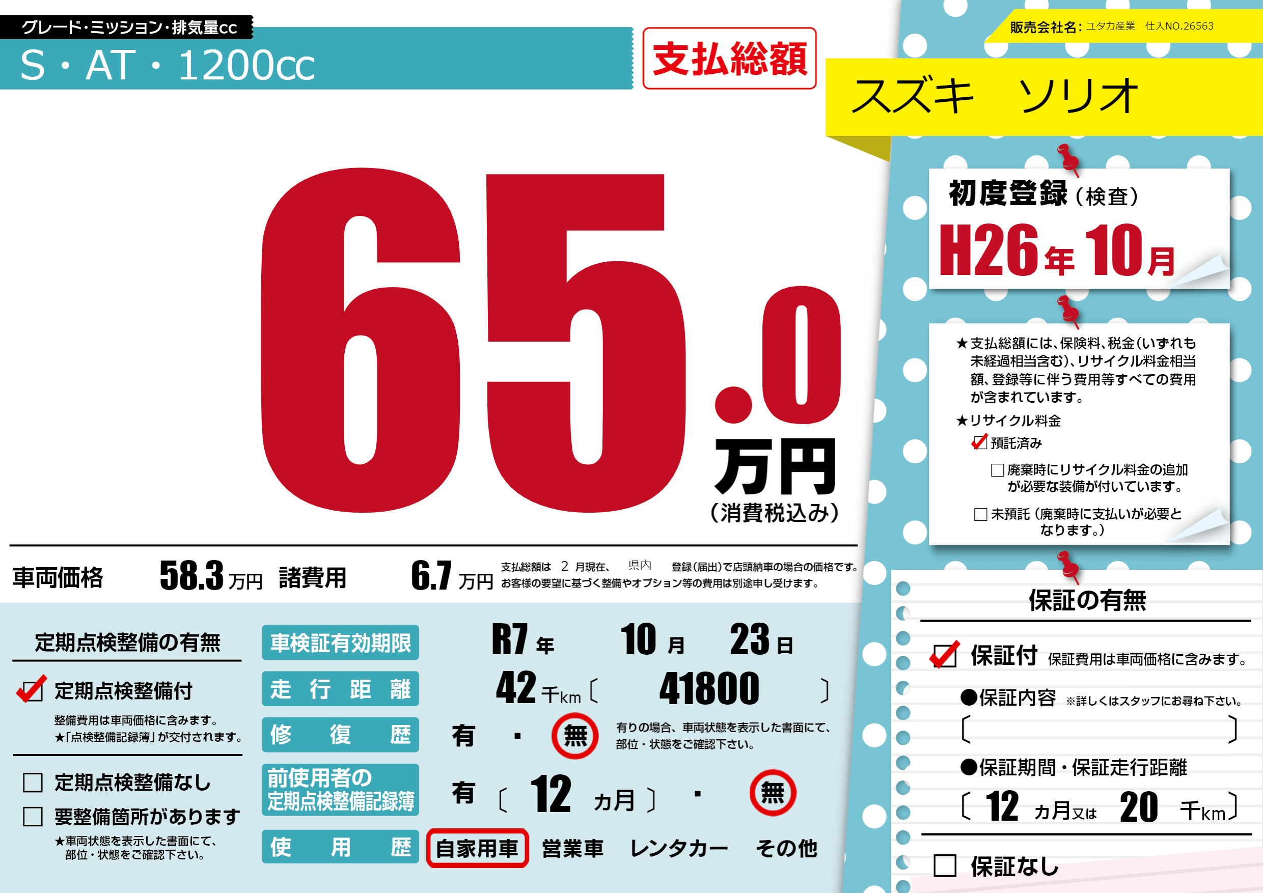 | 車名 | スズキ ソリオ | グレード ミッション 排気量 |