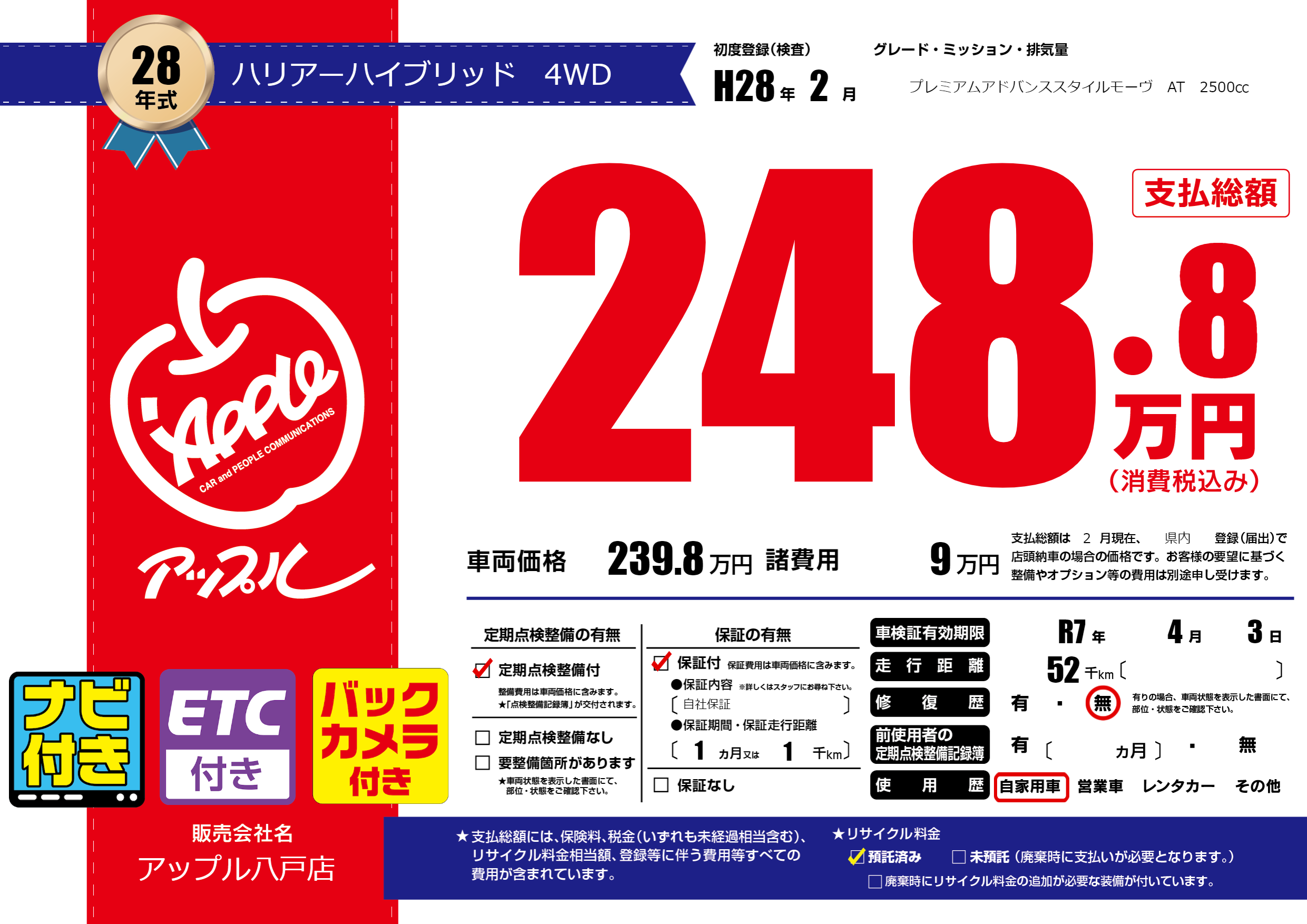 | 走行キロ | 5.2万km | 初年度登録 | H28年2月 |