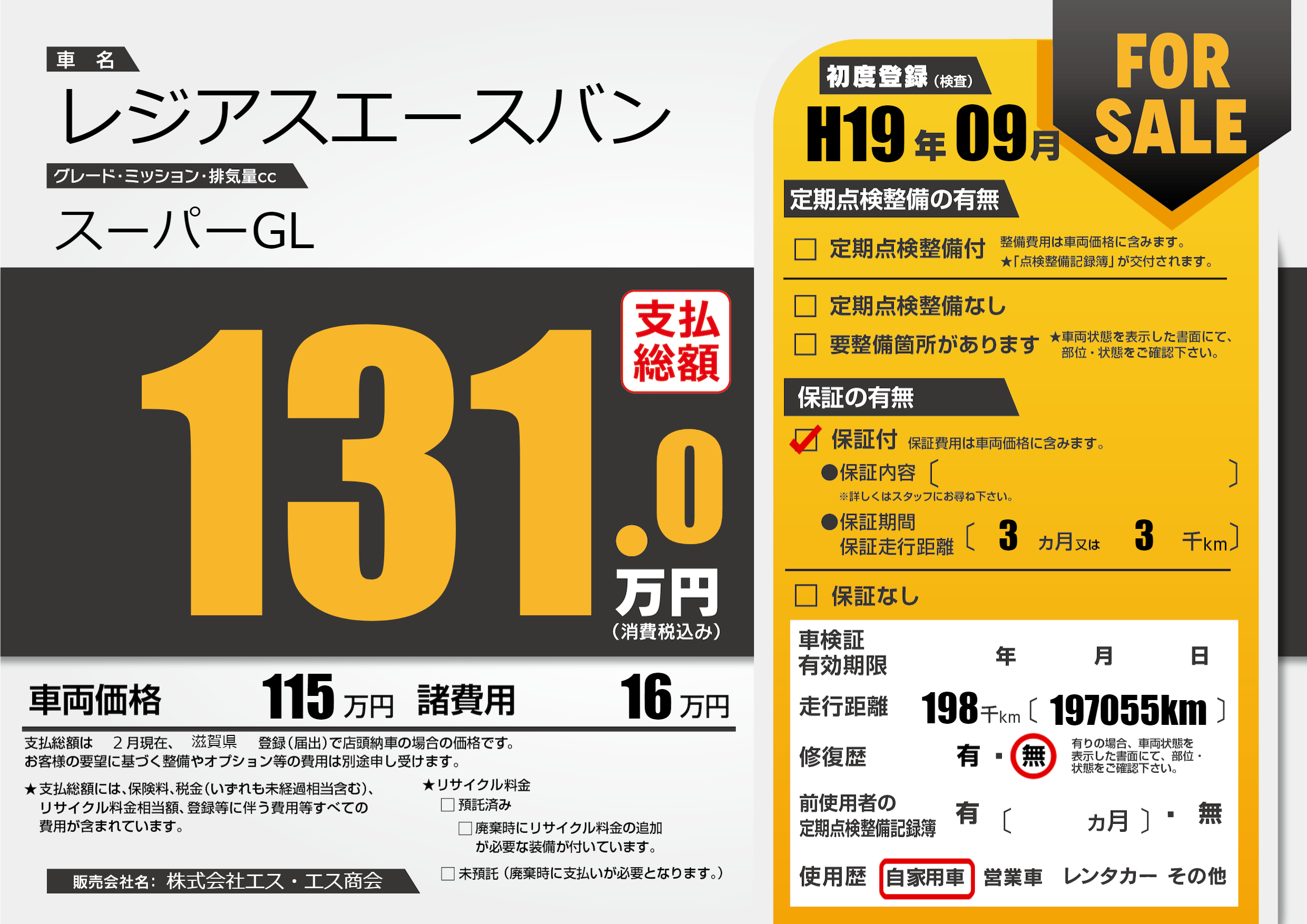 | 車名 | レジアスエースバン | グレード ミッション 排気量 |