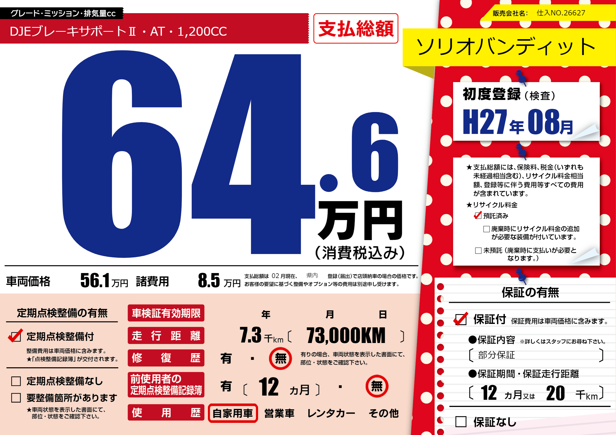 | 車名 | ソリオバンディット | グレード ミッション 排気量 |