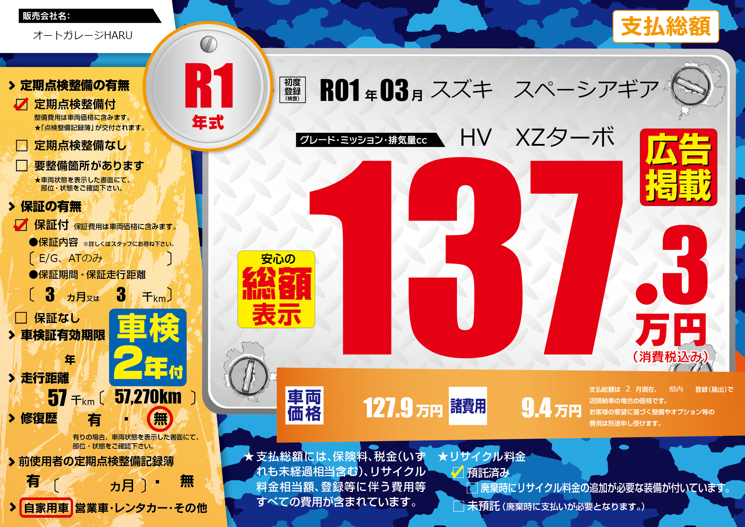 | 走行キロ | 5.7万km | 初年度登録 | R01年03月 |