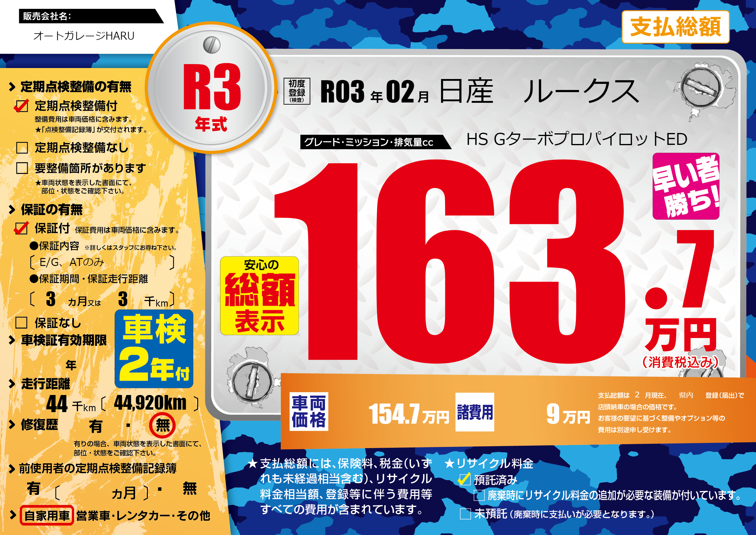 | 走行キロ | 4.4万km | 初年度登録 | R03年02月 |