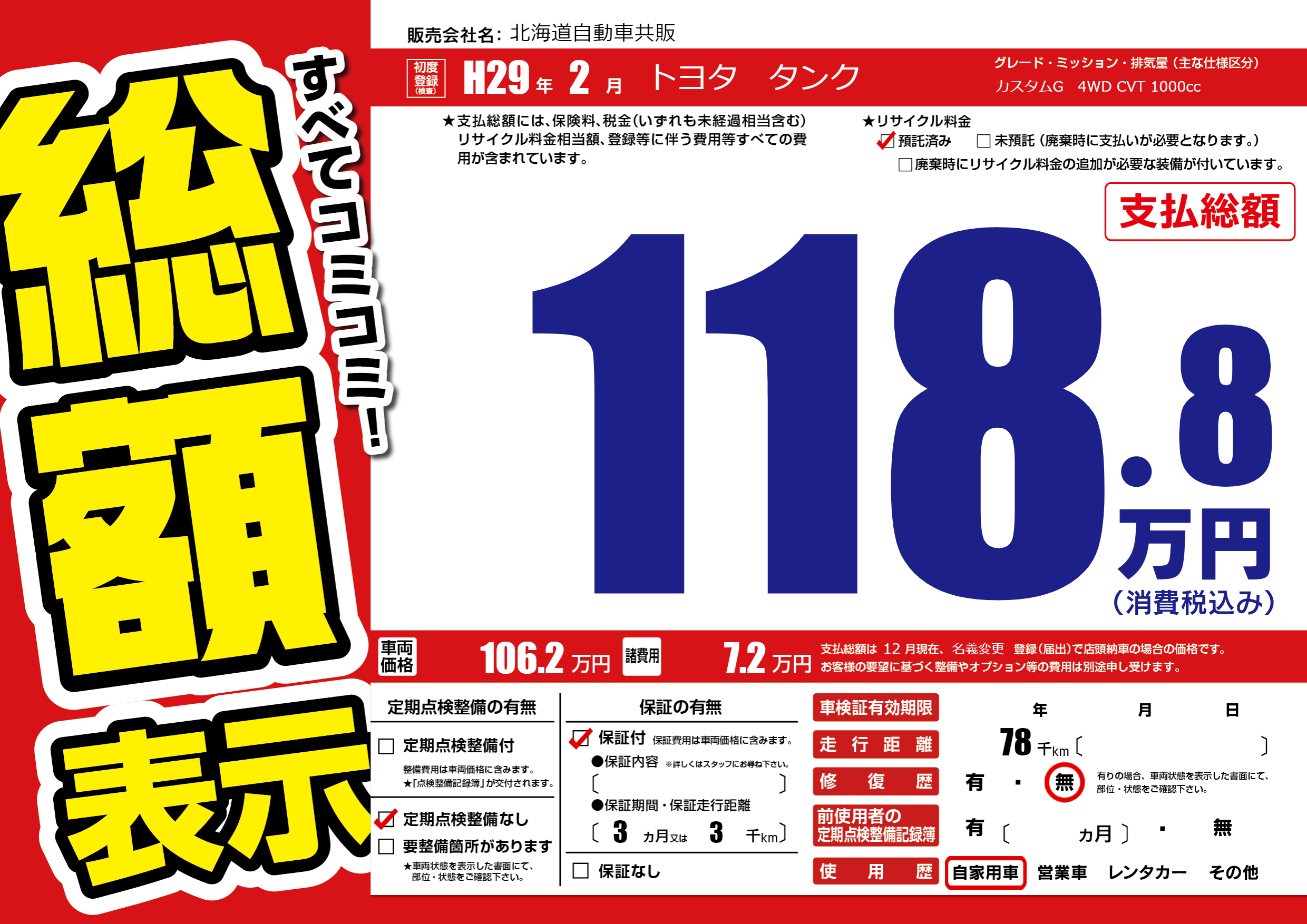 | 車名 | トヨタ タンク | グレード ミッション 排気量 |