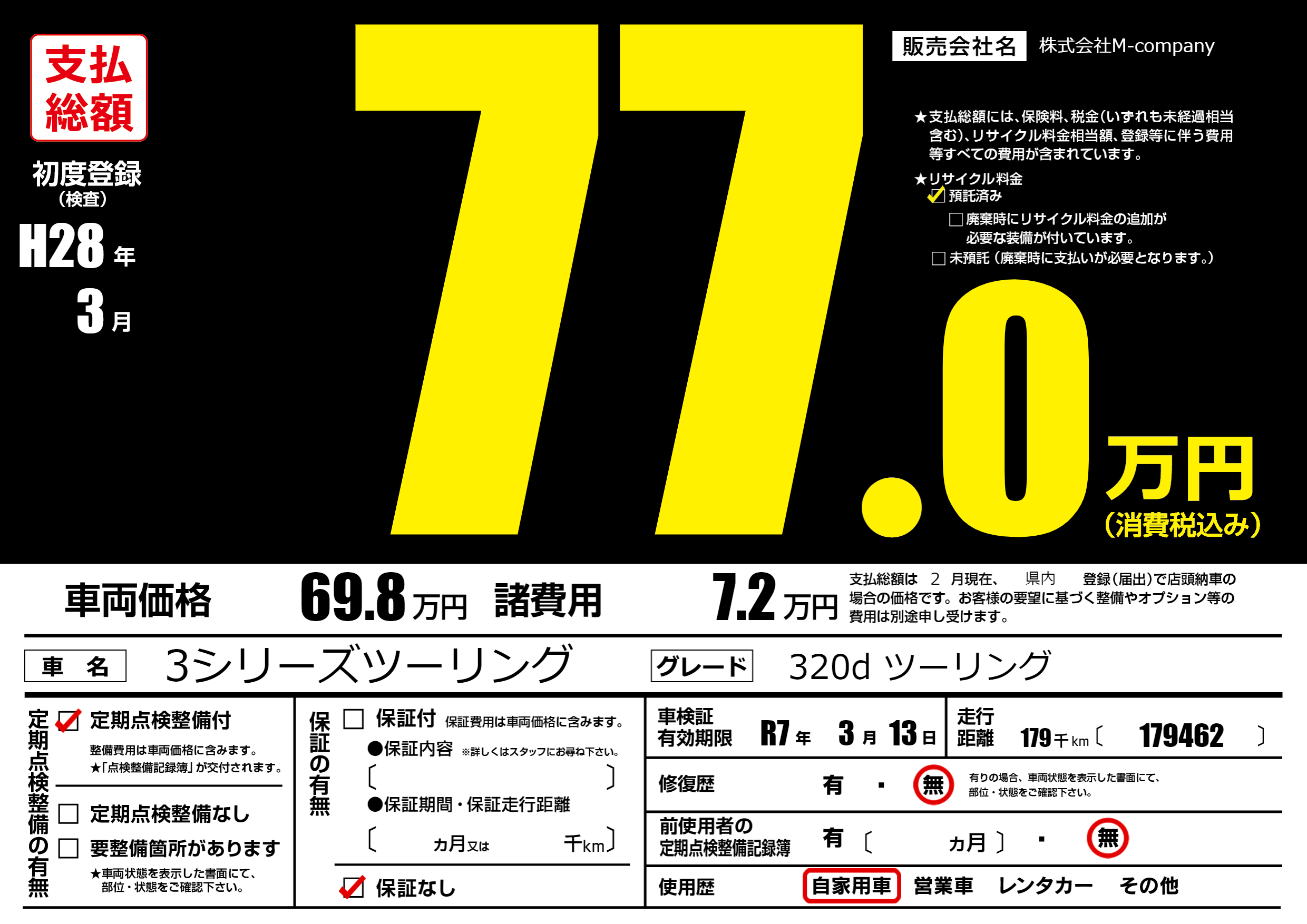 | 車名 | 3シリーズツーリング | グレード ミッション 排気量 |