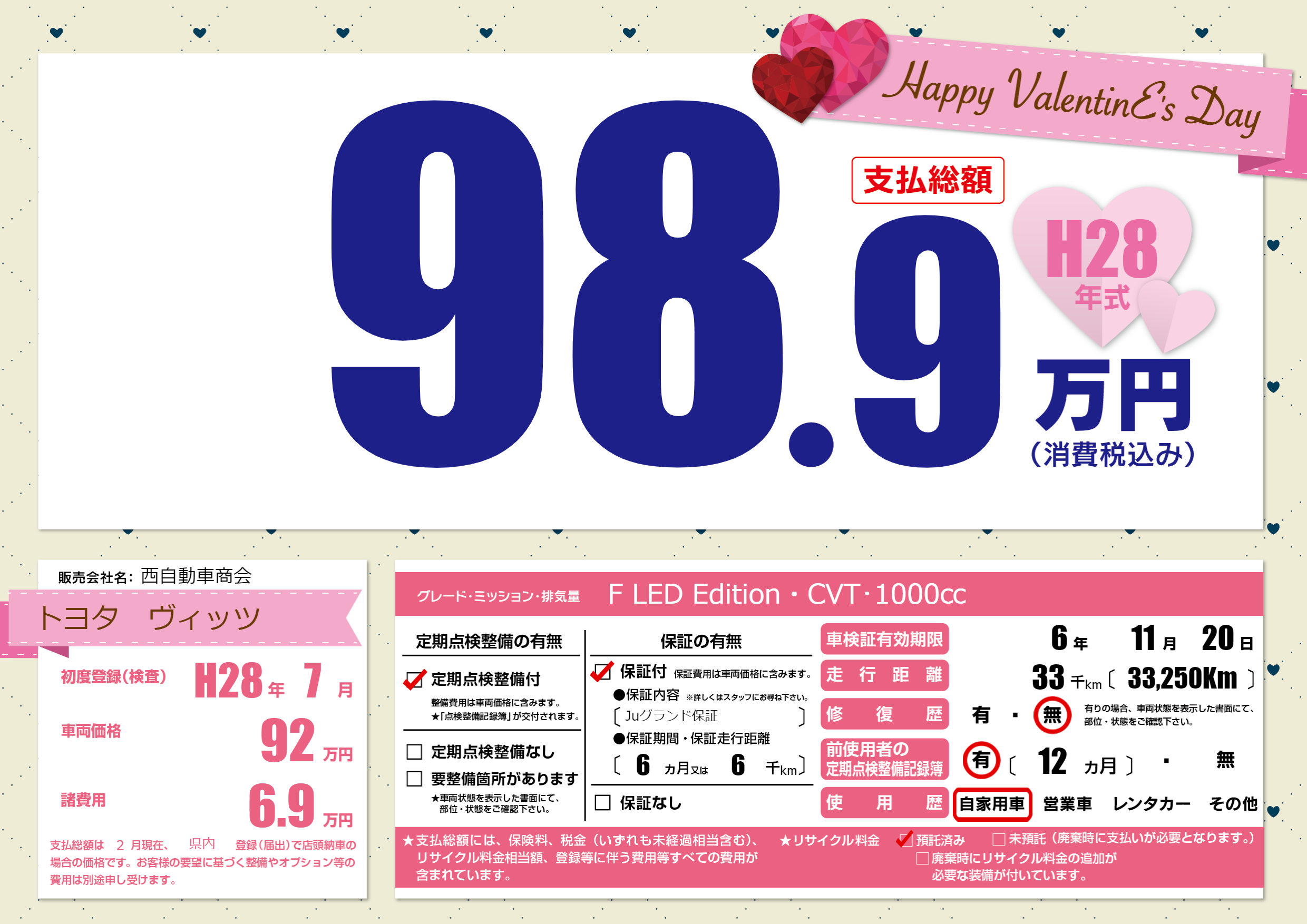 | 走行キロ | 3.3万km | 初年度登録 | H28年7月 |