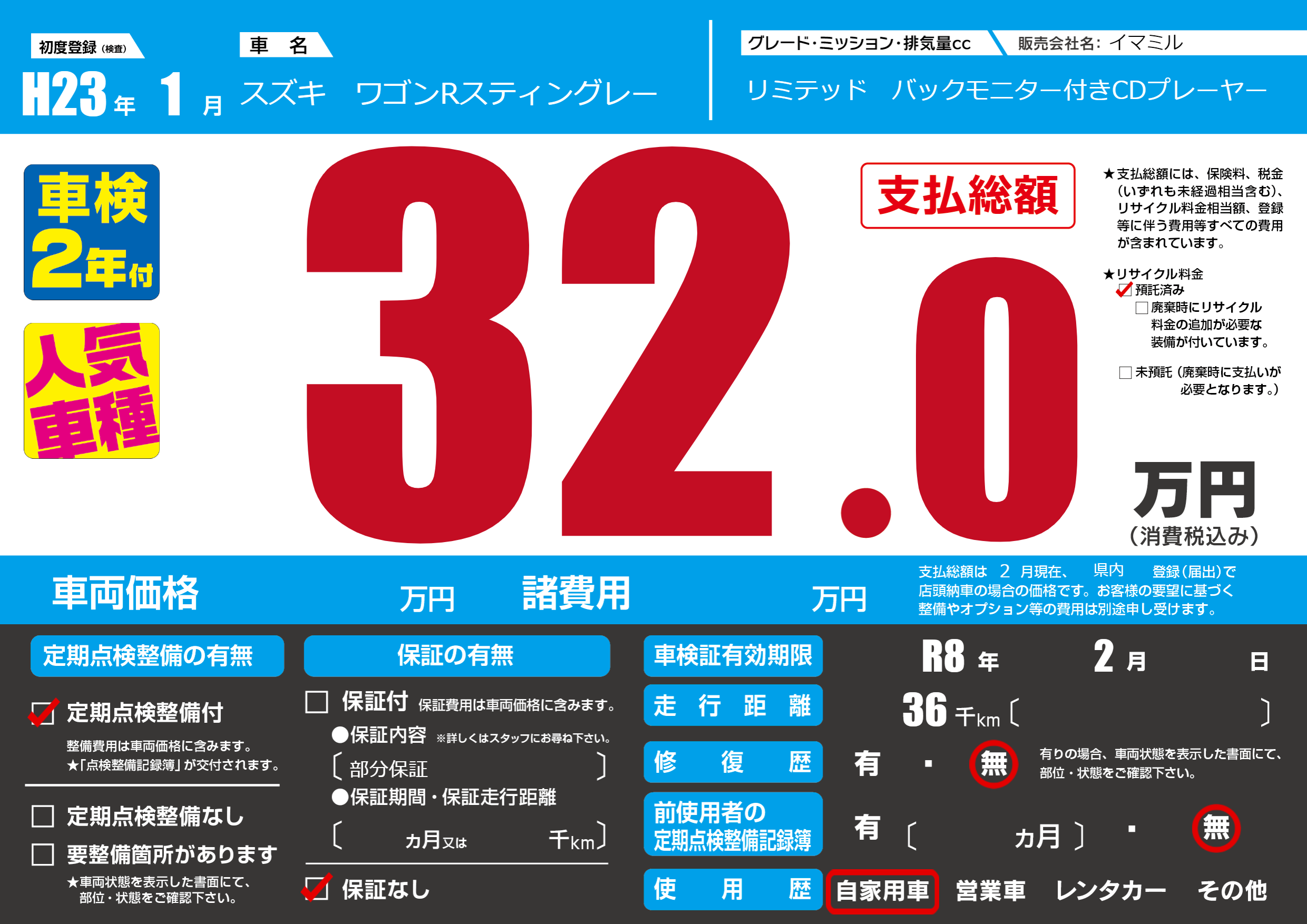| 走行キロ | 3.6万km | 初年度登録 | H23年1月 |