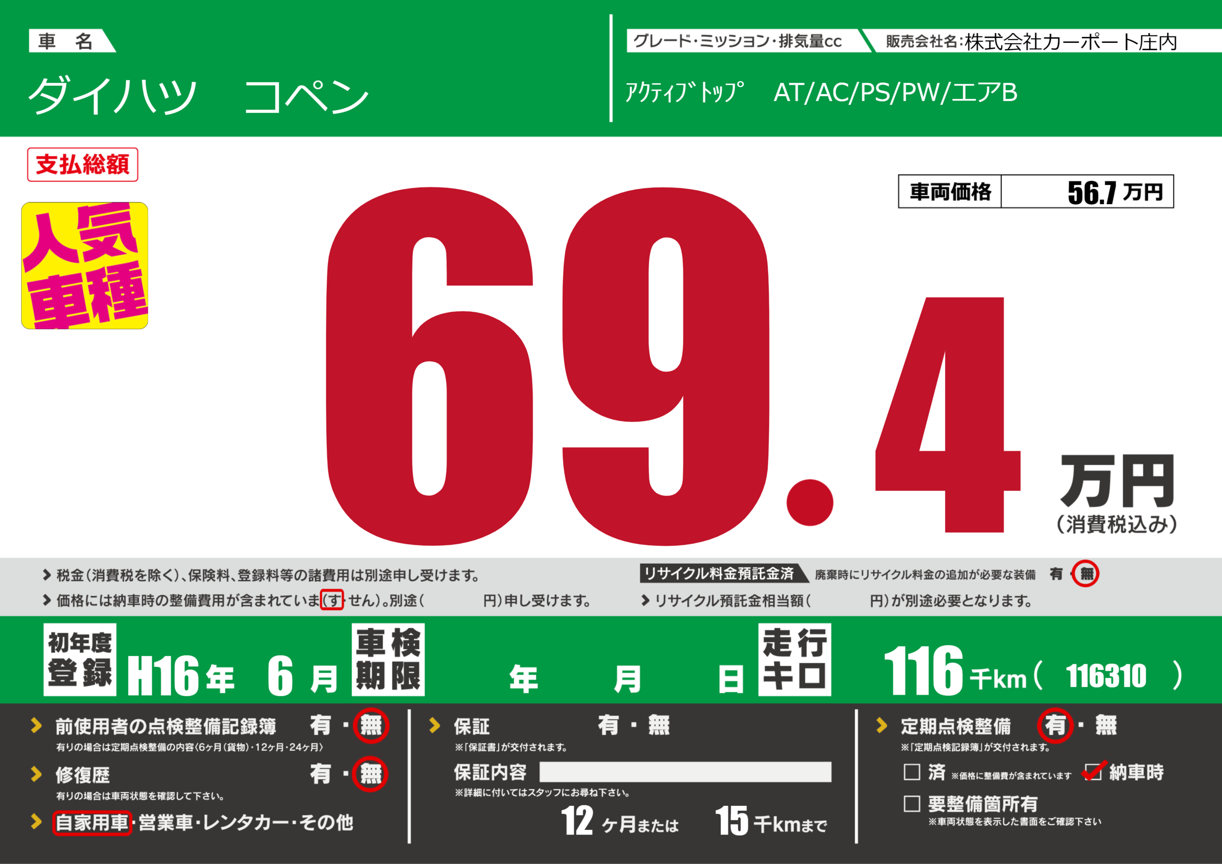 | 車名 | ダイハツ コペン | グレード ミッション 排気量 |