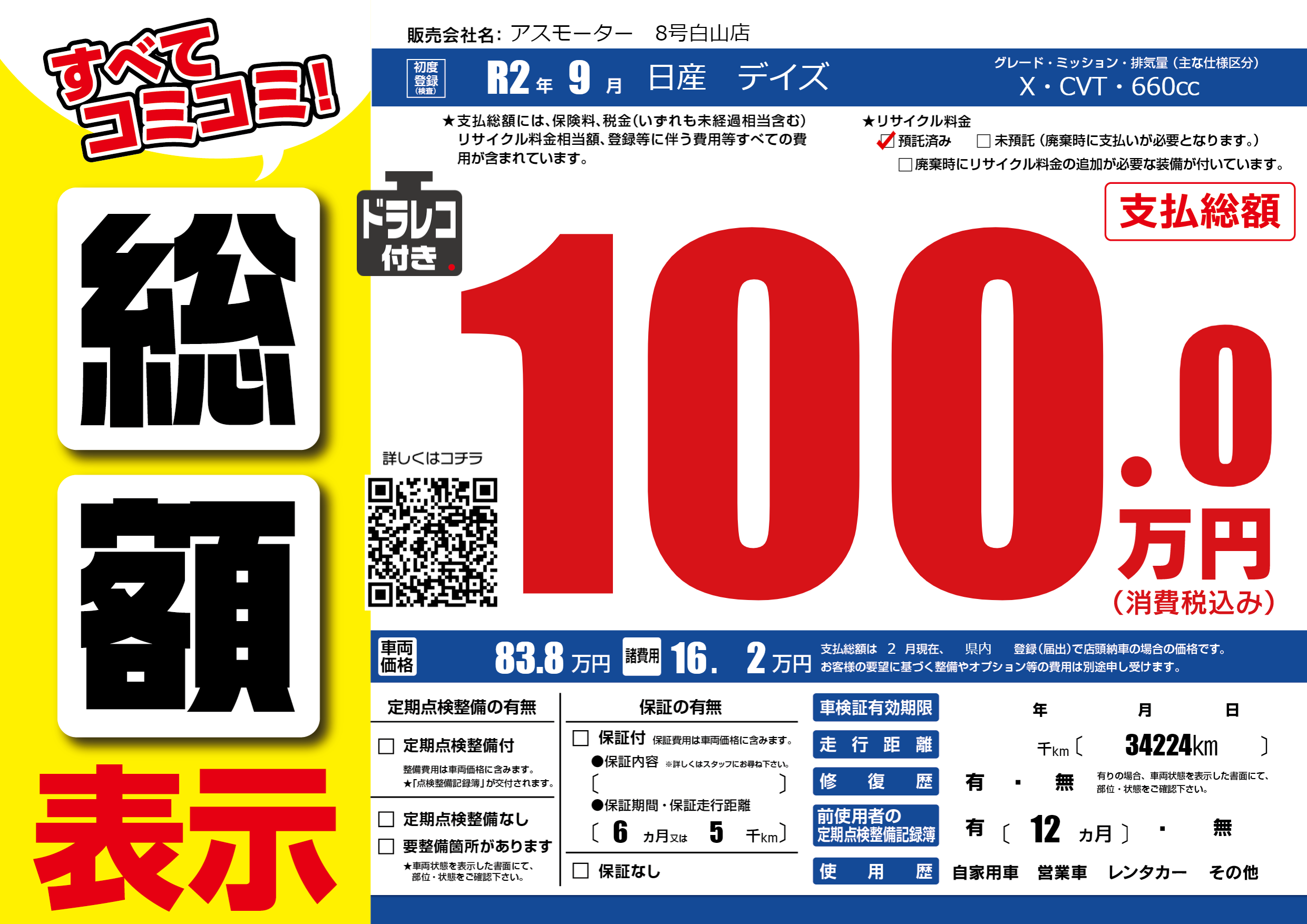| 車名 | 日産 デイズ | グレード ミッション 排気量 |