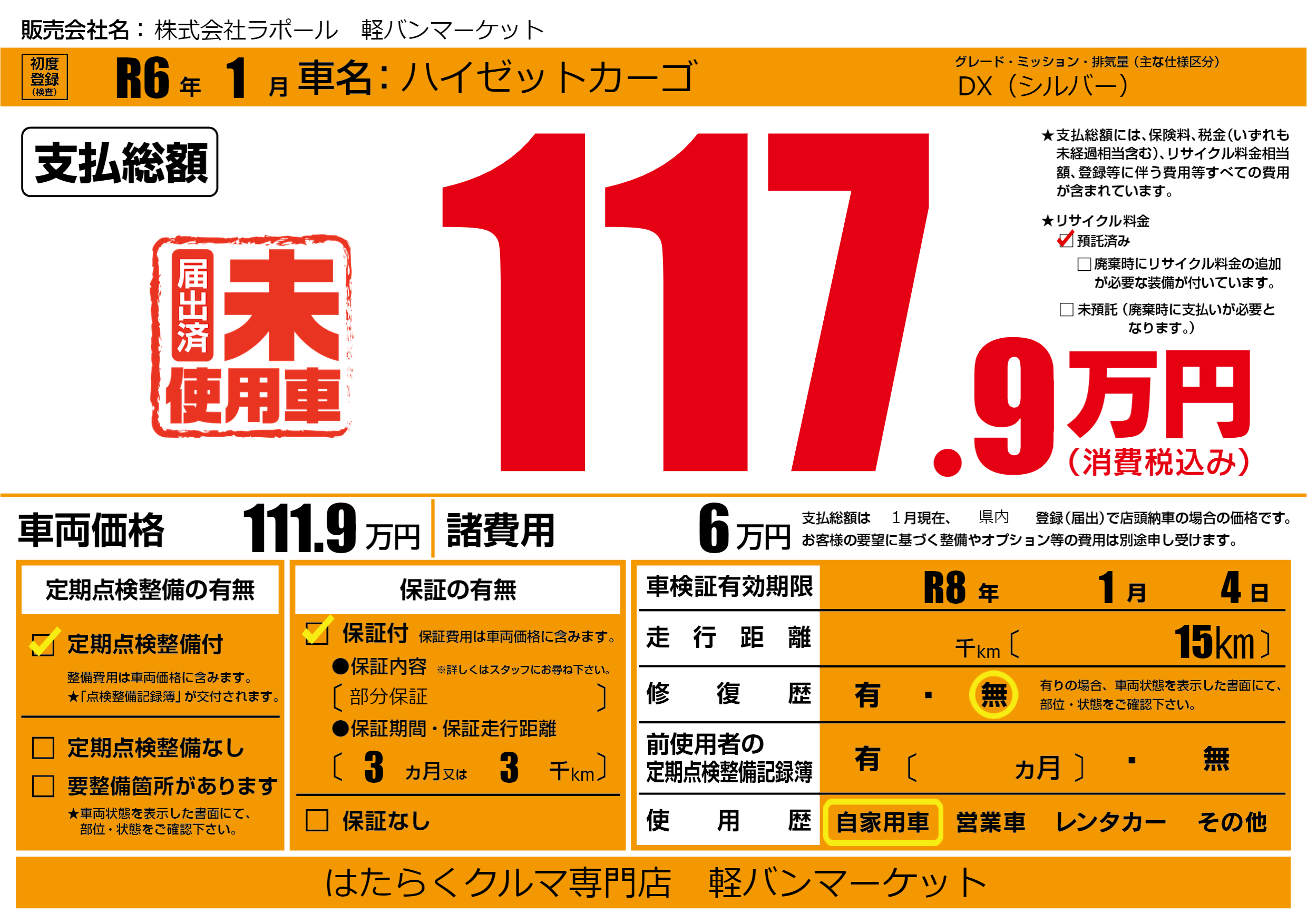 | 車名 | ハイゼットカーゴ | グレード ミッション 排気量 |