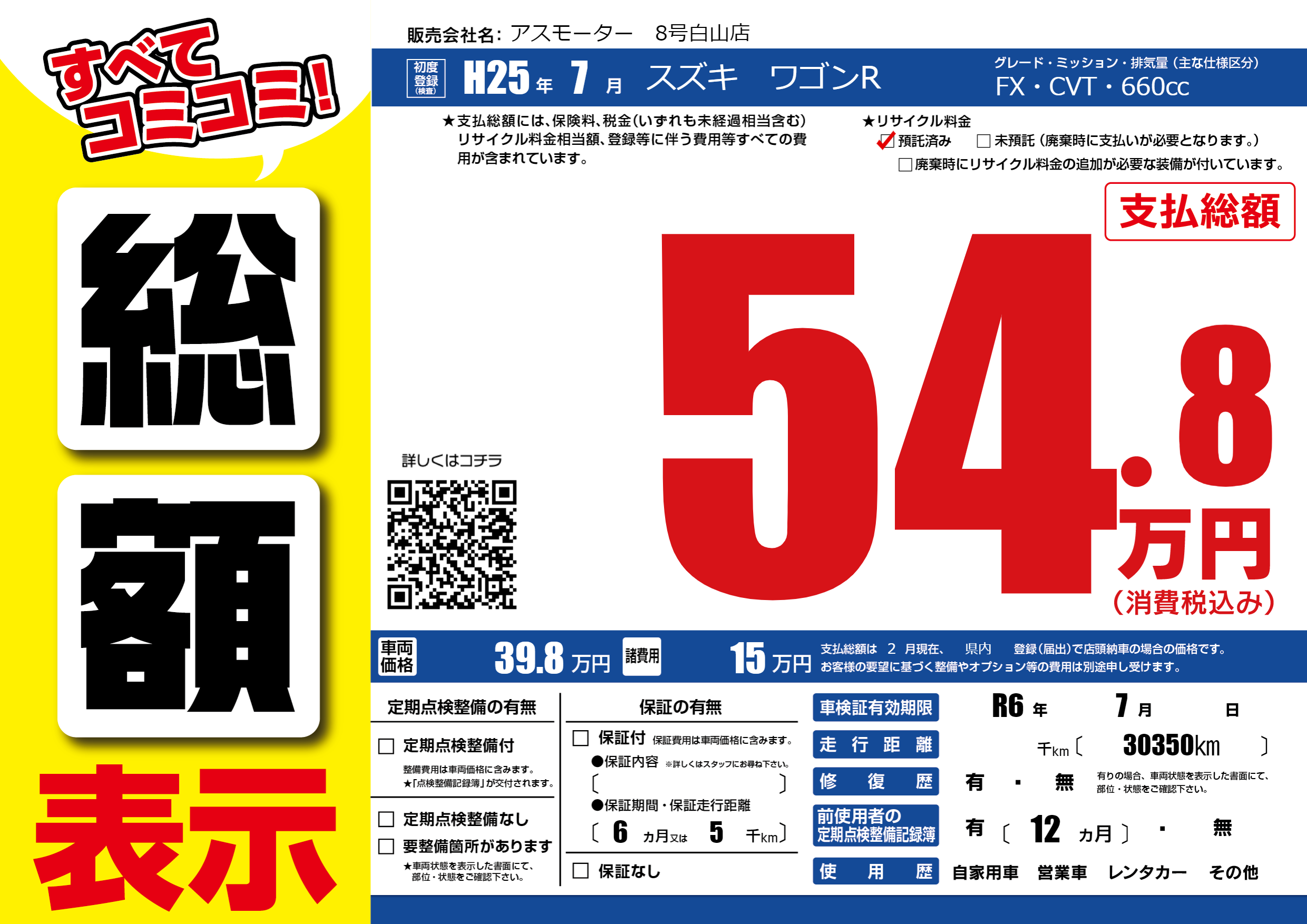 | 車名 | スズキ ワゴンR | グレード ミッション 排気量 |