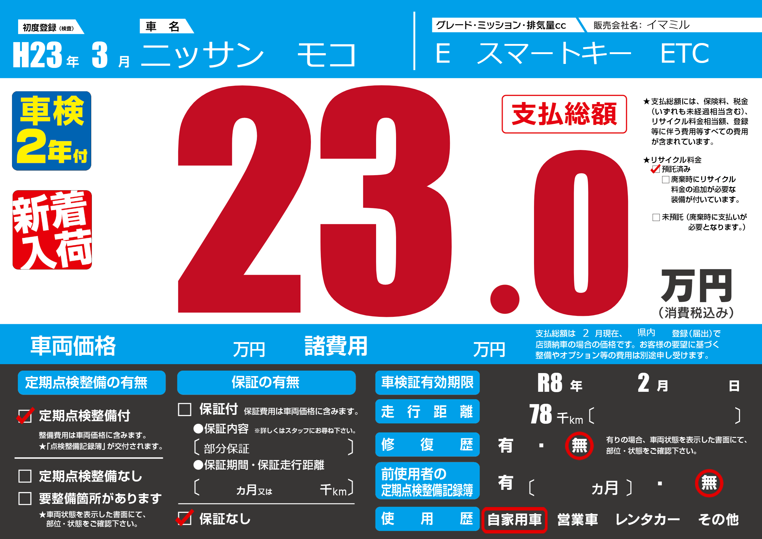 | 走行キロ | 7.8万km | 初年度登録 | H23年3月 |